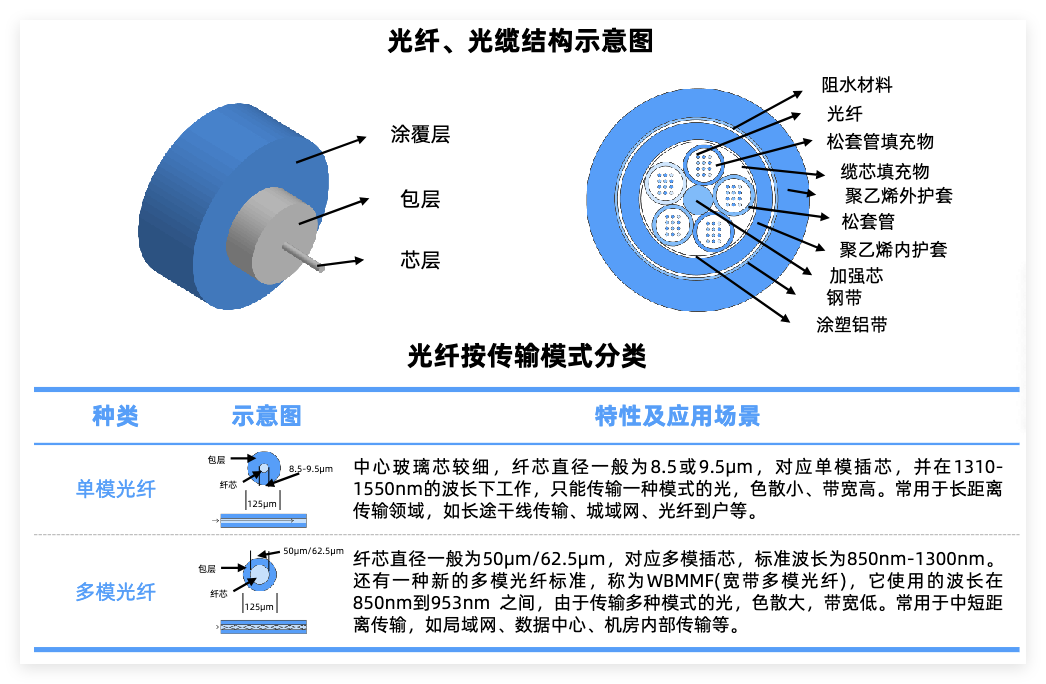 单模光纤:对应直径较小的芯层,允许光用一种模式传输,应用于干网、海底光缆等场景。
