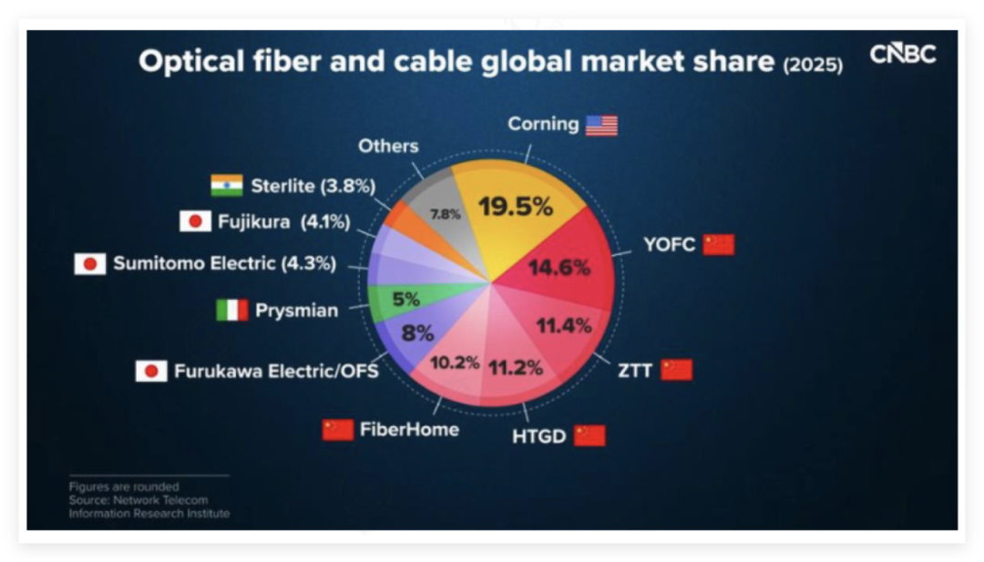 中国厂商整体表现强劲,其中长飞光纤以14.6%的份额排名第二,中天科技和亨通光电分别以11.4%和11.2%的份额位列第三和第四,烽火通信占10.2%。