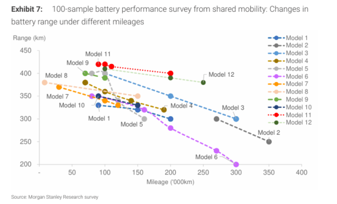 摩根士丹利之前做过一项调研,选取了国内四大一线城市12款共享出行电动汽车,采集分析了100份样本,对比发现,宁德时代的电芯,展现出了行业最低的衰减率。