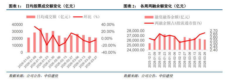 1、上半年交投活跃度同比大增趋势确立,全年增长或超预期。截至2026年2月底,沪深A股日均股票成交额达27425亿元,同比增速80%。即便保守假设3~6月日均成交额回落至2.0万亿元,上半年整体日均成交额仍可达2.2万亿元,同比增速60%;若下半年日均成交额维持2.0万亿元,全年日均成交额将达2.1万亿元,同比增长22%。随着A股交投活跃度逐步企稳,券商经营业绩的弹性超预期概率显著提升。