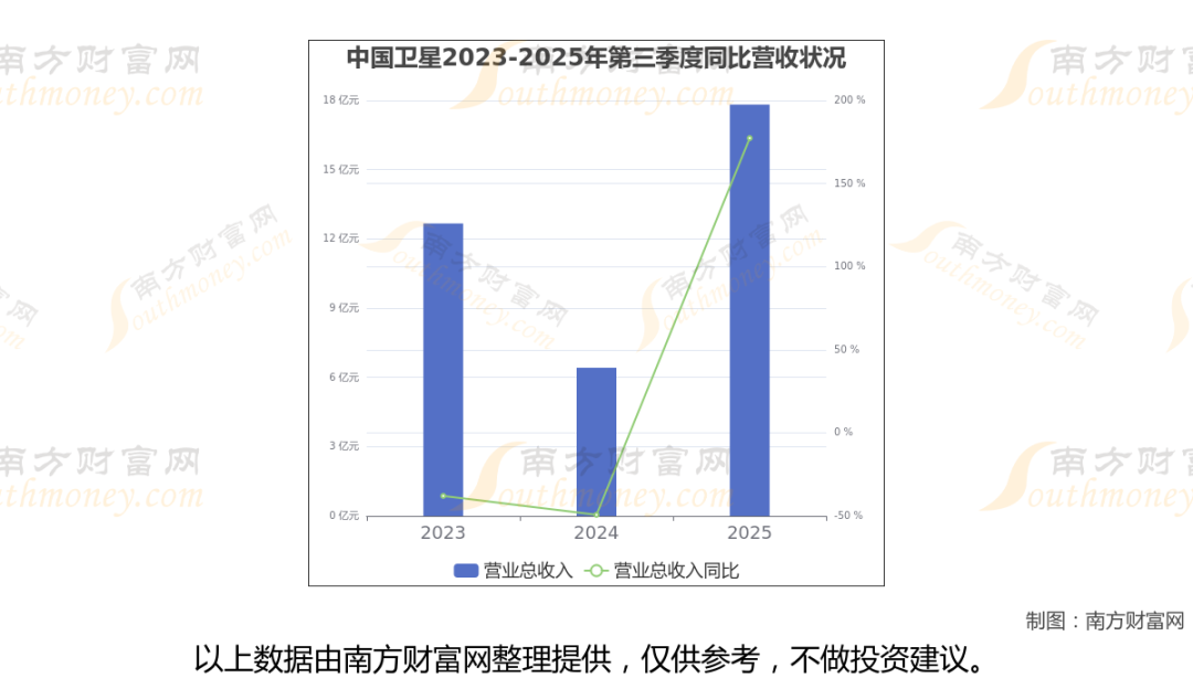 (如上图)中国卫星披露2025年第三季度报告,报告期实现营收17.82亿元,同比177.31%。
