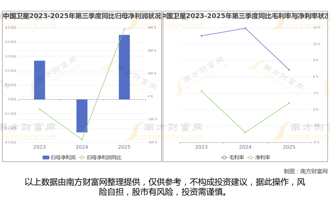 2025年第三季度季报显示,中国卫星公司实现净利润4530.29万,同比上年增长率为294.92%,毛利率7.3%,归属净利润4530.29万,同比增长294.92%。