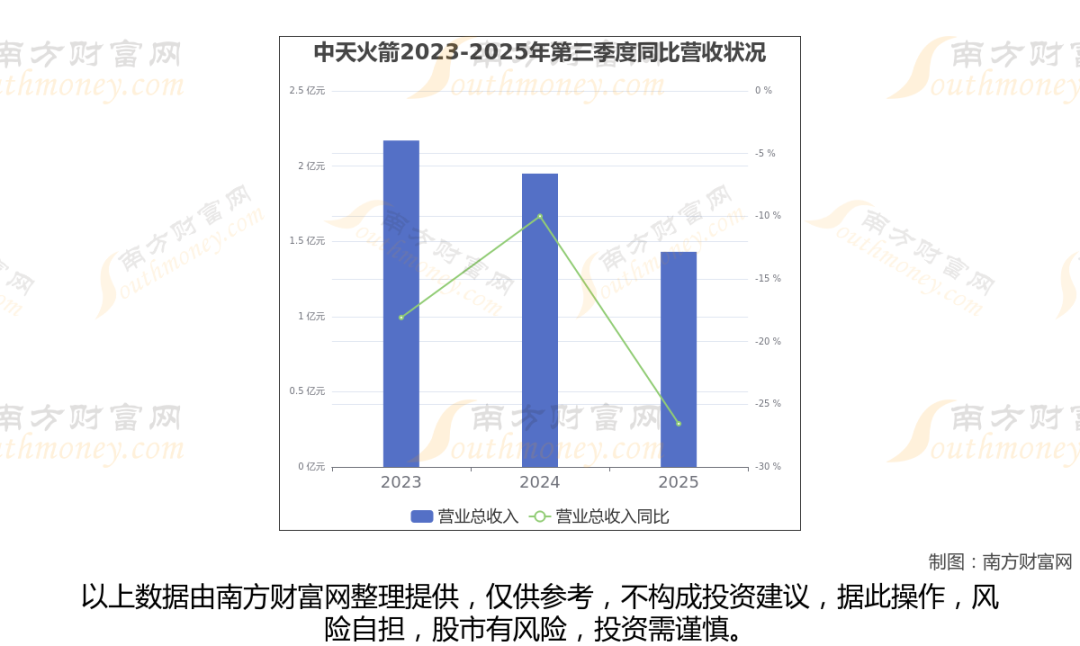 中天火箭2025年第三季度报告显示(如上图),公司实现主营业务收入1.43亿元,较去年同期增长-26.55%。