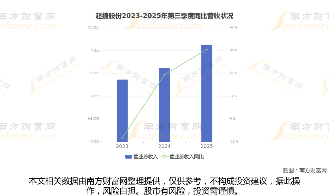于2025年第三季度,超捷股份披露了其业绩表现(如上图),其中主营业务收入2.12亿元,相较于去年同期30.41%。
