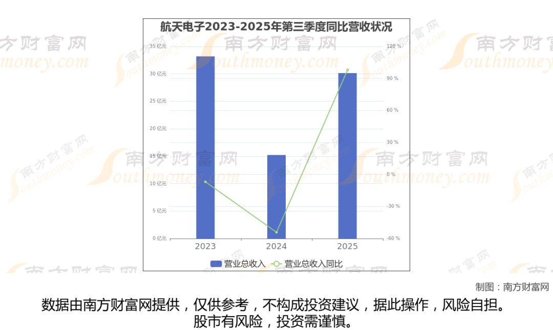 航天电子2025年第三季度报告显示(如上图),公司实现主营业务收入30.14亿元,较去年同期增长97.97%。