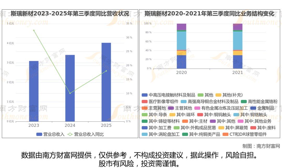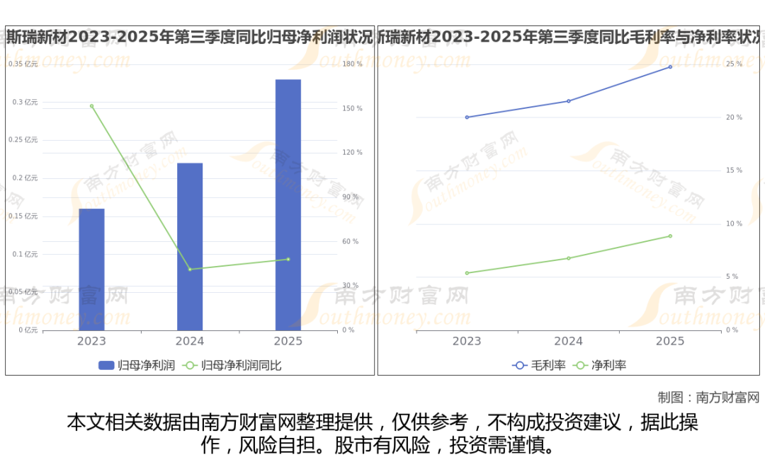 2025年第三季度季报显示,斯瑞新材公司实现净利润3306.77万,同比上年增长率为48.07%,毛利率24.75%,归属净利润3306.77万,同比增长48.07%。