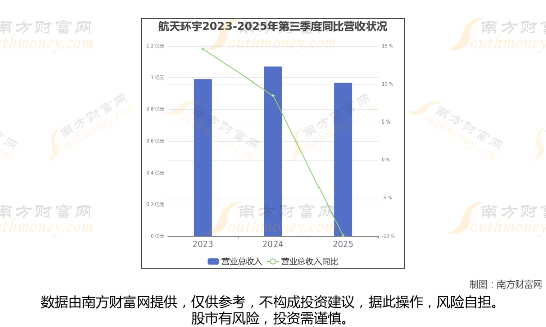 在2025年第三季度,航天环宇的业绩表现(如上图),主营业务收入达到9657.36万元,实现了-9.91%的同比增长率。