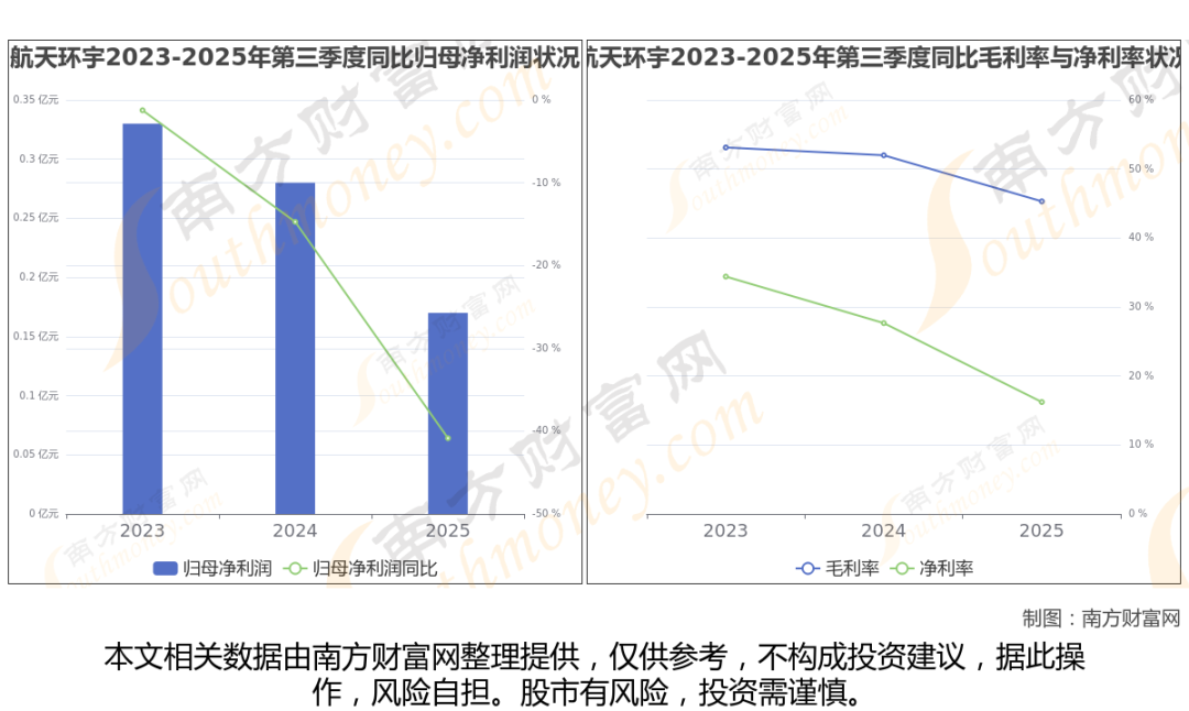 2025年第三季度季报显示,航天环宇公司实现净利润1677.68万,同比上年增长率为-40.85%,毛利率45.31%。