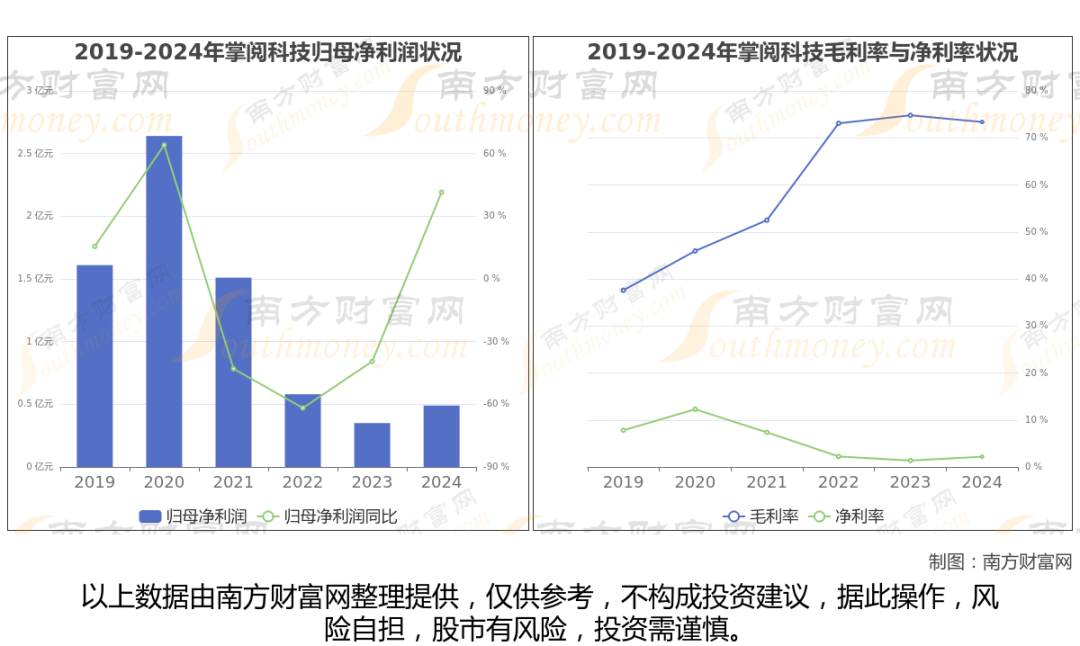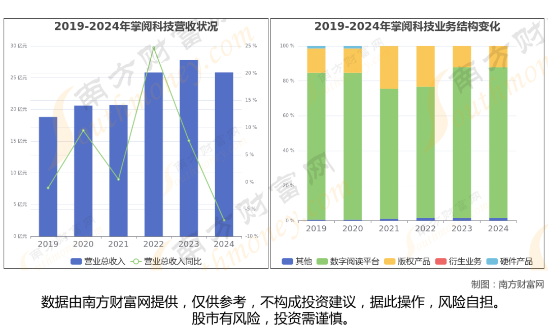 根据公司年度数据显示(如上图),2024年,掌阅科技实现营业总收入25.83亿,同比增长-7.02%,近5年复合年增长率5.81%。