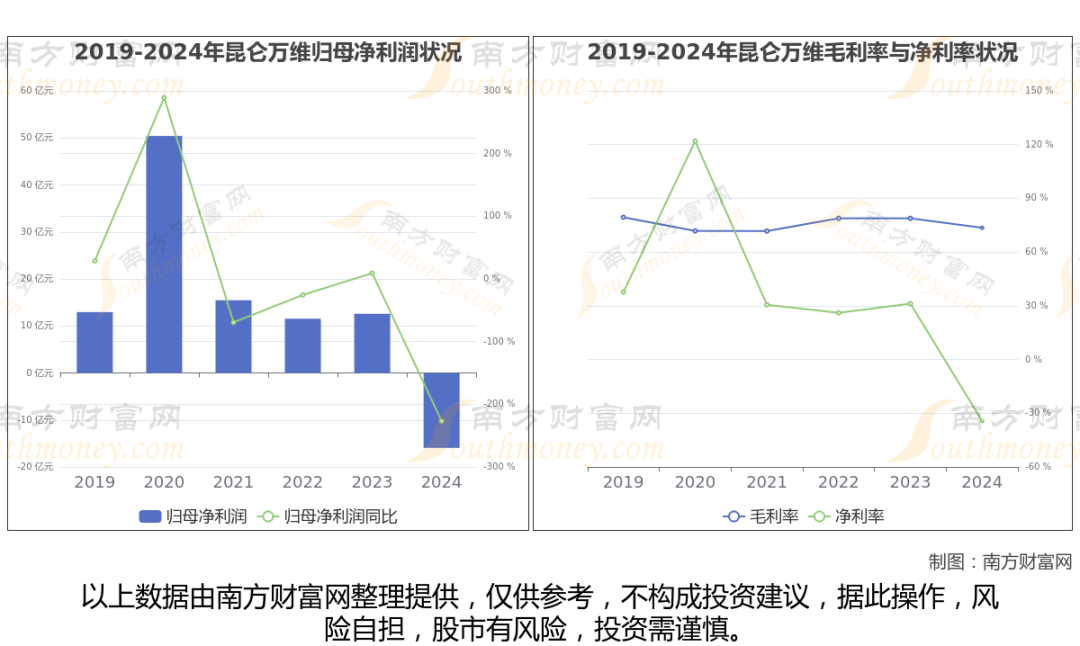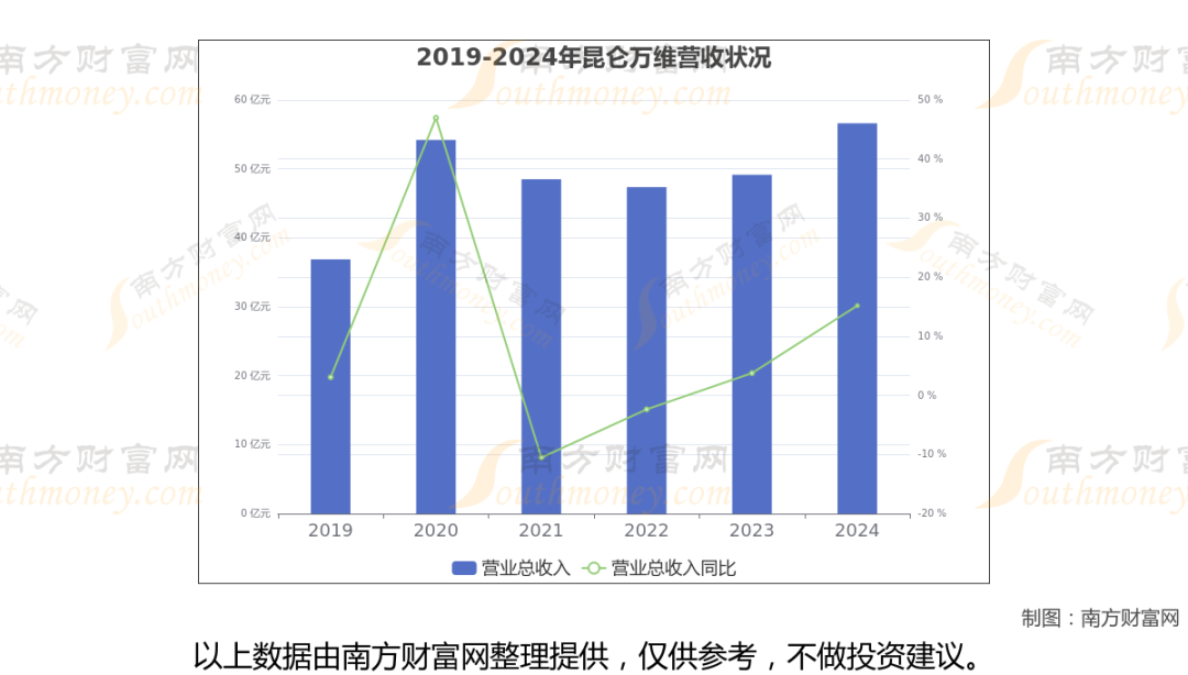 昆仑万维2024年数据显示(如上图),公司2024年营业收入56.62亿,同比增长15.2%,近五年复合年增长率1.1%。