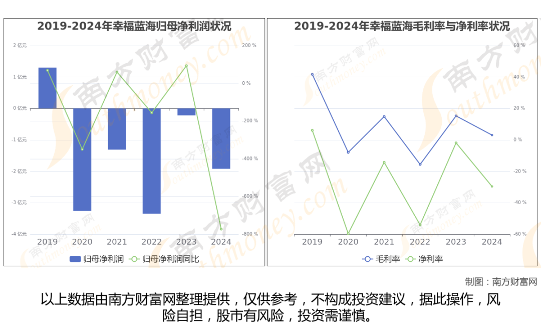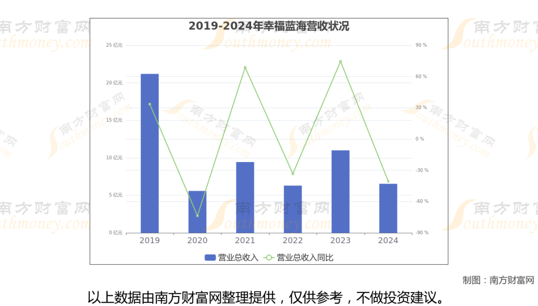 幸福蓝海2024年数据显示(如上图),公司2024年营业收入6.54亿,同比增长-40.53%,近五年复合年增长率3.99%。