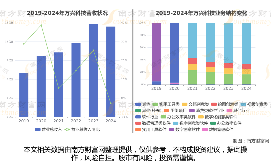 (如上图)2024年万兴科技公司营业总收入14.4亿,同比增长-2.78%,近五年复合增长率为10.19%。