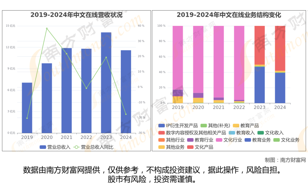 中文在线年报数据显示(如上图),2024年实现营业总收入11.59亿,同比增长-17.73%,近5年复合年增长率4.4%。