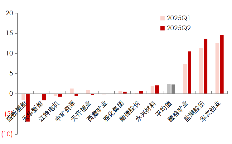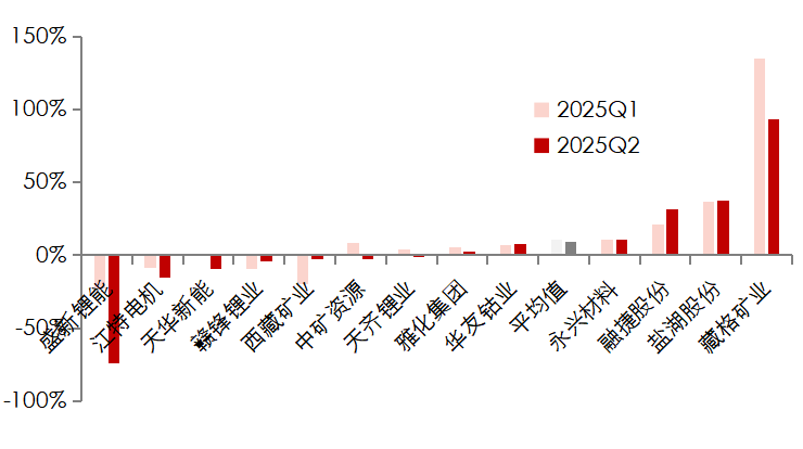 盛新锂能2025Q2净利润环比减少5.32亿元至-6.86亿元,是本季度净利润变化最大的公司,主要系其毛利润环比减少1.04亿元同时计提存货跌价准备等资产减值4.38亿元,盛新控股及参股企业在2025上半年多处于亏损状态,其中津巴布韦Max Mind净亏损1.65亿元,印尼盛拓净亏损1.1亿元,奥伊诺矿业与致远锂业合计亏损将近1亿元。