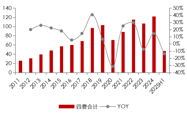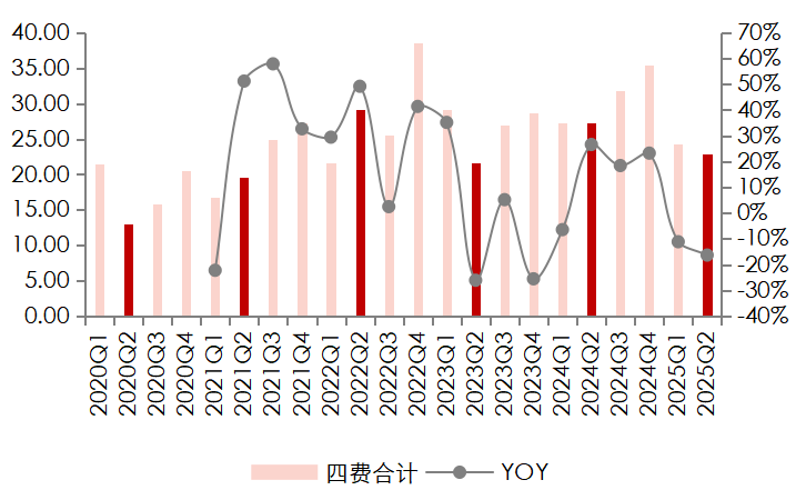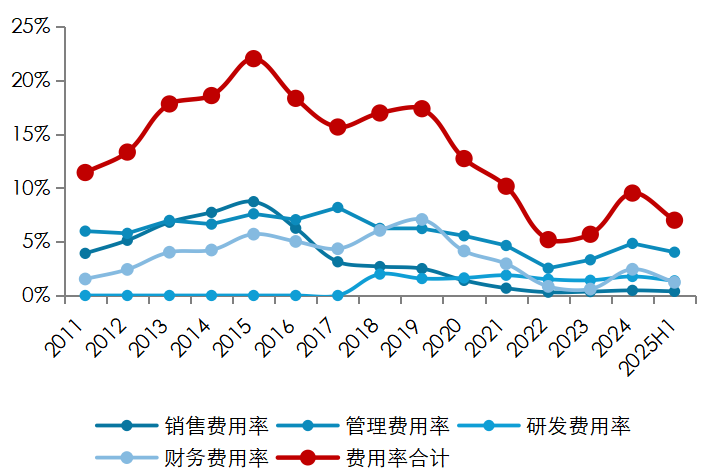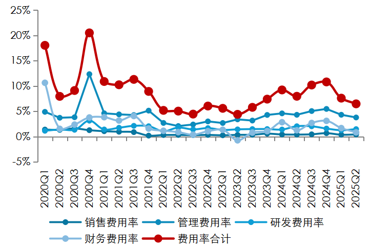 四费费用:2025Q2财务费用支出减少,管理及销售费用下降空间所剩无几