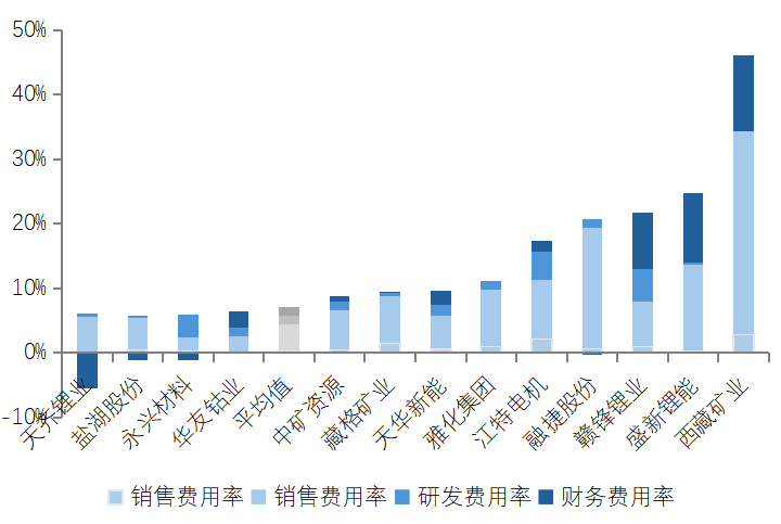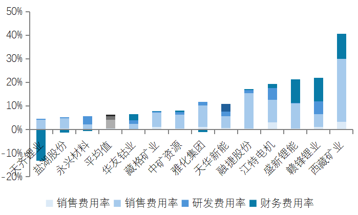 永兴材料、天齐锂业与盐湖股份是锂矿上市公司管理层面,控制成本较好的公司。我们发现永兴材料和盐湖股份等海外业务涉及较少的公司管理费用率较低,同时财务费用少,不易受汇率波动等影响造成大额财务支出。