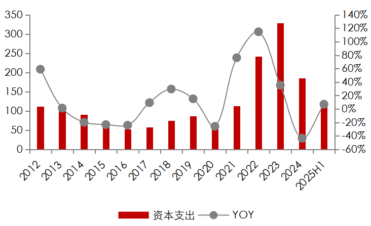 12家A股锂上市企业2025上半年资本开支共计115亿元,同比增加7%,与22、23年相比资本开支增速显著放缓。从资本开支周期来看,当下已经进入磨底期。