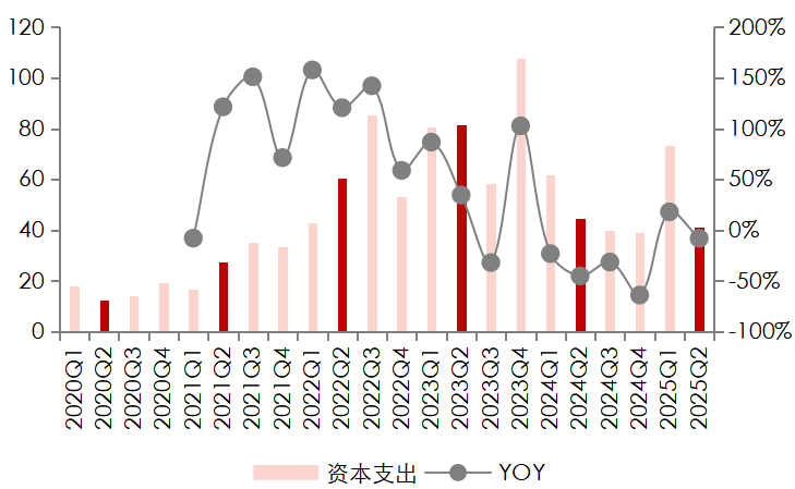 分季度来看,2024年以来上市公司资本开支整体平稳,绝对值普遍低于锂价高涨时刻。2025Q2上市公司资本开支41亿元,同比减少8.0%,资本开支符合周期底部支出预期。