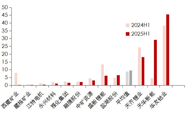 图表25:2025H1年A股12家锂上市公司资本开支(亿元)