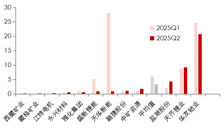图表26:2025Q2 A股12家锂上市公司资本开支(亿元)