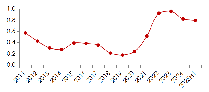 2)中资企业业绩承压能力强。A股企业在周期下行期极力降低费用支出,2025Q2样本企业四费费用共计22.87亿元,同比减少16.3%,环比减少5.9%,四费费用率仅为6.47%,目前四费费用与费用率均已处于年度低点水平。且虽部分企业出现亏损情况,但企业的偿债能力仍相对稳定,总体杠杆仍处于安全区。