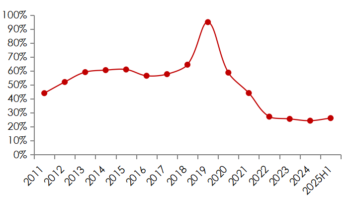12家A股锂上市企业2025年H1锂盐营业收入145.0亿元,同比下降42.9%,占上市公司整体收入的22%。锂盐业务营收收入下降主要系锂价同比下降较多,据SMM,2025Q2电池级碳酸锂平均售价为6.53万元/吨,同比下跌38.4%,环比下跌13.9%。锂价的大幅波动使得锂盐业务在上市公司业绩层面的贡献占比从2024H1的30%下降至22%。