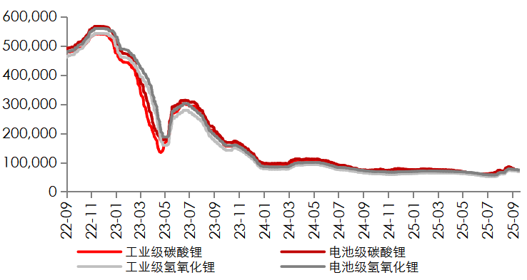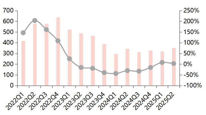 2025Q2中国锂盐产量增速放缓。2025Q2中国锂盐产量29.9万吨,同比增4%,环比增10%。新项目投产减少造成锂盐季度产量同比增速下滑。