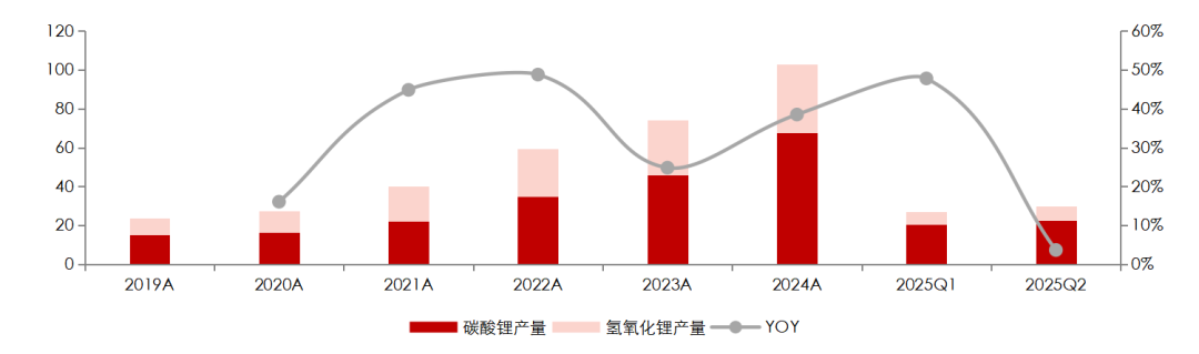 2)产量:2025Q2中国锂盐产量增速放缓;