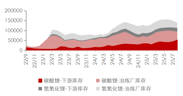 2024年供需错配下中国锂盐社会库存大量增加,2025年受宁德复产和宏观扰动影响,锂盐继续累库。2025年以来,受宁德枧下窝重启开工、美国关税增大锂盐需求侧的宏观不确定性等影响,市场接货情绪低迷,库存继续攀升,4月底中国锂盐库存升至15.35万吨,锂盐供应充足叠加Q2低迷的锂价触及部分企业生产成本,企业销售意愿低,2025Q2全季度锂盐市场库存维持在超15万吨。7、8月份伴随着“金九银十”的到来,下游备货意愿显著增加,锂盐库存由冶炼厂向下游流动且整体呈现去库趋势,截至2025年8月底,锂盐社会库存供给13.94万吨。