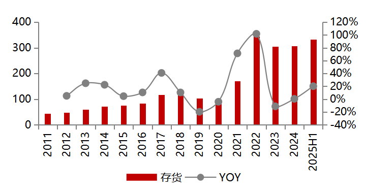 上市公司仍背负一定的存货压力。从上市公司存货价值量来看,2025上半年存货价值量同比增加,大量且低价的库存使部分企业选择计提存货减值。