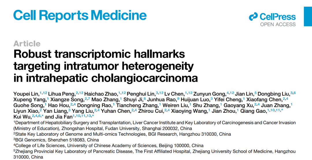 2026年3月30日,复旦大学附属中山医院联合华大基因,在Cell Reports Medicine上发表一项突破性研究成果,首次系统揭示了肝内胆管癌的基因表达异质性,并提出了一套全新的分子分型系统,以攻克肿瘤异质性导致的分型难题,为这种难治性癌症的精准治疗提供了“导航图”。(点击文末“阅读原文”,查看研究原文)