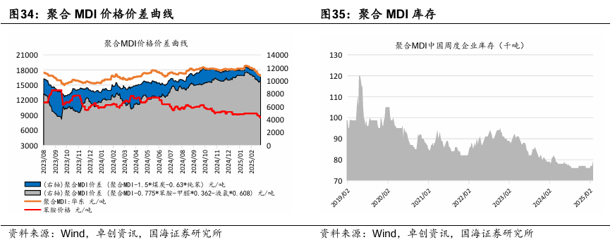 据卓创资讯,4月4日,纯MDI价格17600元/吨,环比3月28日下降50元/吨;4月4日,聚合MDI价格16325元/吨,环比3月28日持平。4月4日,公司发布烟台产业园乙烯二期项目建成投产公告。2025年4月3日,万华化学烟台产业园120万吨/年乙烯装置成功产出合格乙烯产品,乙烯二期项目一次开车成功。该项目以石脑油和乙烷作为原料,通过优化资源配置形成新质生产力,提升产业链竞争力和盈利能力。本周国内聚合MDI下游采购量略有提升。来自冰箱冷柜行业需求略有减弱,大型工厂多为厂家直供户;无甲醛板材胶黏剂、板材大厂、汽车行业需求一般,这几大行业多为国内厂家直供客户;北方外墙喷涂、管道保温行业、中小冰箱厂、中小型胶黏剂厂、冷库等行业采购量略有增加。本周国内纯MDI下游多小单采购。TPU、鞋底、浆料行业开工四到五成。本期氨纶开工负荷86%,环比稳定。