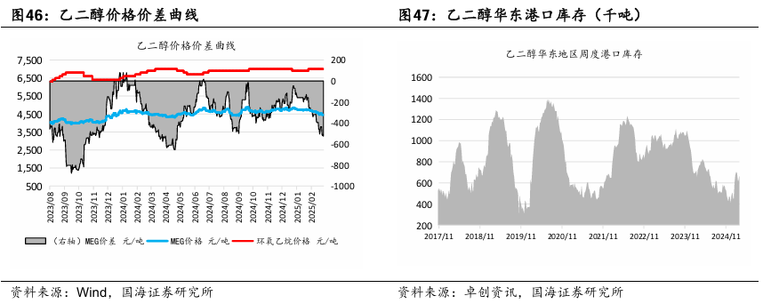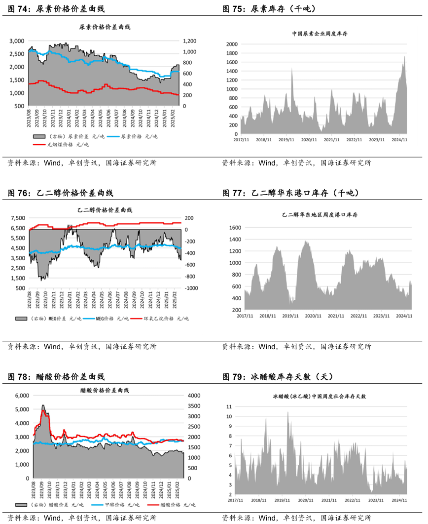 三友化工:截至2023年末,公司粘胶短纤市占率约18%,纯碱产品市占率约11%,价格上涨带来的业绩弹性较大。公司长期致力于主业发展,截至2023年末,纯碱、粘胶短纤维年产能分别达到 340 万吨、78 万吨,是国内纯碱、化纤知名企业。截至2023年末,公司 PVC、烧碱、有机硅单体年产能分别达到 52.5 万吨、53 万吨、20 万吨,行业内均有一定的影响力。公司年产 20 万吨有机硅扩建项目目前已进入试生产阶段,项目达产后,公司有机硅单体产能将达到 40 万吨/年。随着生产规模的不断扩大,公司规模经济效益显著,行业竞争力明显提升。据百川盈孚,2025年4月3日粘胶短纤现货价为13450元/吨,环比3月28日下降50元/吨。华鲁恒升:华鲁恒升的低成本为公司核心竞争优势。公司重视先进技术的引进与消化吸收并自我提升,致力打造精品高效工程,从源头降低投资成本;公司以煤气化平台为基础,构筑一体化运行模式,创建多产品链协同生产;深挖装置与系统潜力,提高资源综合利用率;公司坚持精益化管理,坚持降本控费;依托固有优势,持续推进产业链的延伸拓展和产品的迭代升级,开辟新的盈利增长点。公司秉承创新驱动发展理念,通过不断的技术创新,掌握了一批核心关键技术;依托洁净煤气化技术,构建了可持续发展的产业技术平台,形成“一头多线”循环经济柔性多联产运营模式。据百川盈孚,2025年4月3日乙二醇价格为4514元/吨,环比3月28日下降2元/吨。据卓创资讯,2025年4月3日尿素小颗粒价格为1980元/吨,环比3月28日上升40元/吨。