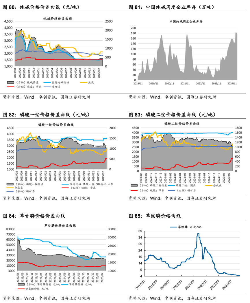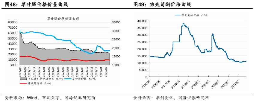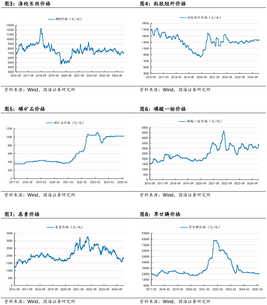 金禾实业:金禾实业深耕食品添加剂行业,已成为安赛蜜、三氯蔗糖和麦芽酚等领域全球龙头。截至2023年底,公司食品添加剂产能4.01万吨,公司产品价格处于历史较低分位,叠加公司一体化生产成本优势,公司未来盈利潜力较大。控股子公司金沃生物年产5000吨甲乙基麦芽酚项目已进入正式生产阶段,未来不断丰富扩展下游高附加值产品,助力业绩长期增长。据Wind,2025年4月3日安赛蜜市场均价达3.8万元/吨,环比3月28日持平;三氯蔗糖市场均价达25万元/吨,环比3月28日持平;麦芽酚市场均价达8.0万元/吨,环比3月28日持平。瑞华泰:PI膜性能居于高分子材料金字塔的顶端,应用范围广泛,具有非常高的技术壁垒。公司自主掌握高性能PI薄膜的核心技术,包括合成、设备、工艺等技术,形成了从专用树脂合成到连续双向拉伸薄膜的完整制备技术。公司现有PI薄膜产能约900吨左右,在全球市场占有率约5.5%。随着资金问题的解决,公司进入加速扩张期。当前折叠屏手机有望迎来产业发展期,未来随着公司两个项目陆续投产,公司业绩有望迎来快速增长。赞宇科技:赞宇科技主要以棕榈油为原料生产油脂化工和表面活性剂,是油化、表活龙头企业,公司印尼杜库达子公司低价采购棕榈油优势明显,同时杭州油化还拟投2万吨OPO结构脂,用于高端奶粉。截至2024年上半年,公司表面活性剂年产能突破120万吨,油脂化学品年产能突破100万吨,洗护用品OEM/ODM加工服务能力达到110万吨。国瓷材料:国瓷材料是我国新材料公司标杆,是无机新材料平台型公司。国瓷熟练掌握了水热法核心技术,内生的MLCC陶瓷粉、氧化锆、氧化铝均达到世界级水平;外延并购的王子制陶(陶瓷制品)和爱尔创(氧化锆下游制品)均是公司产品的下游。国瓷产品除了技术同源性强,市场规模也非常可观。大市场为公司提供了高速成长的舞台。外延并购为国瓷新产品打开了市场渠道,公司利用先进的DBS精益并购管理系统发展外延业务,做到产品不仅能造得出来,还能卖得出去。扬农化工:公司是菊酯行业寡头,菊酯为高效低毒农药,随着优嘉三期投产,释放菊酯年产能1.08万吨,公司聚酯产能大幅增加。截至2023年底,公司草甘膦产能3万吨/年,功夫菊酯产能5500吨/年,三唑类杀菌剂产能8500吨/年。公司积极调整产品结构,主推效力更高的产品,同时公司通过不断投产新项目,扩大规模优势与产品线,不断降低成本。2019年公司购买中化国际持有的中化作物100%股权和农研公司100%股权,公司子公司优嘉公司受让宝叶公司100%股权,完善了研产销一体化的资源配置。“两化”农业资源整合于先正达集团,形成SAS格局,意在优化资源配置,加强产业协同,形成高效完整的供应链,有利于降低生产成本,更具竞争优势。据Wind和百川盈孚,2025年4月4日功夫菊酯原药价格为11.5万元/吨,较3月28日持平;联苯菊酯原药价格为13.0万元/吨,较3月28日持平;草甘膦原药价格为2.32万元/吨,较3月28日持平。