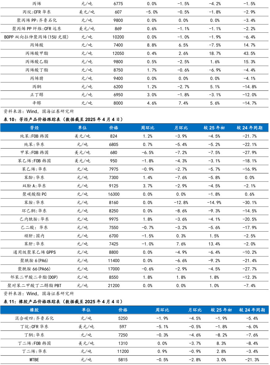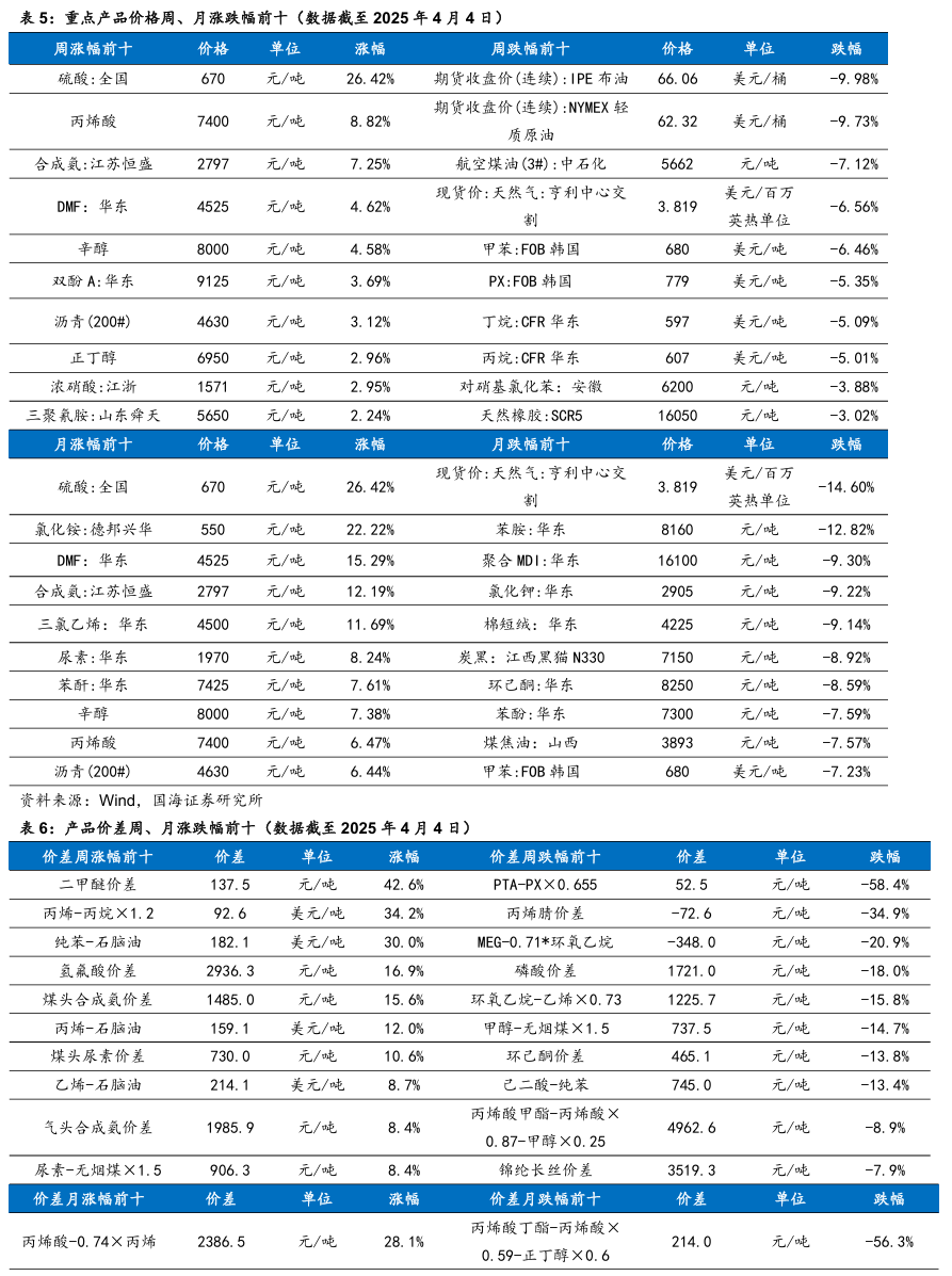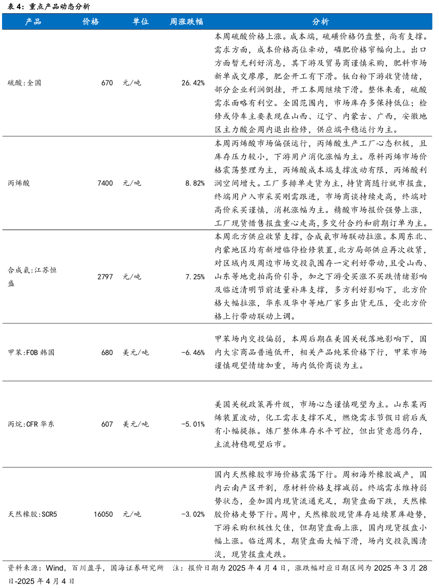 我们跟踪的171种产品的价格中,有33种上涨,占比19.3%,有51种产品下跌,占比29.82%。周涨幅前五的产品分别为:硫酸:全国(26.42%)、丙烯酸(8.82%)、合成氨:江苏恒盛(7.25%)、DMF:华东(4.62%)、辛醇(4.58%)。周跌幅前五的产品分别为:期货收盘价(连续):IPE布油(-9.98%)、期货收盘价(连续):NYMEX轻质原油(-9.73%)、航空煤油(3#):中石化(-7.12%)、现货价:天然气:亨利中心交割(-6.56%)、甲苯:FOB韩国(-6.46%)。本周(2025年3月28日-4月4日,下同)本周硫酸:全国价格上涨。成本端,硫磺价格仍盘整,尚有支撑。需求方面,成本价格高位牵动,磷肥价格窄幅向上。出口方面暂无利好消息,其下游及贸易商谨慎采购,肥料市场新单成交廖廖,肥企开工有下滑。钛白粉下游收货情绪,部分企业利润倒挂,开工本周继续下滑。整体来看,硫酸需求面略有利空。全国范围内,市场库存多保持低位;检修或停车主要表现在山西、辽宁、内蒙古、广西,安徽地区主力酸企周内退出检修,供应端平稳运行为主。本周丙烯酸市场偏强运行。丙烯酸生产工厂心态积极,且库存压力较小,下游用户消化涨幅为主。原料丙烯市场价格震荡整理为主,丙烯酸成本端支撑波动有限,丙烯酸利润空间增大。工厂多排单走货为主,持货商随行就市报盘,终端用户入市采买刚需跟进,市场商谈持续走高,终端对高价采买谨慎,消耗涨幅为主。精酸市场报价强势上涨,工厂现货惜售报盘重心走高,多交付合约和前期订单为主。本周合成氨:江苏恒盛价格上涨。本周东北、内蒙地区均有新增临停检修装置,北方局部供应再次收紧,对区域内及周边市场交投氛围存一定利好带动,且受山西、山东等地竞拍高价引导,加之下游受买涨不买跌情绪影响及临近清明节前适量补库支撑,多方利好影响下,北方价格大幅拉涨,华东及华中等地厂家多出货无压,受北方价格上行带动联动上调。本周甲苯甲苯场内交投偏弱。本周后期在美国关税落地影响下,国内大宗商品普遍低开,相关产品纯苯价格下行,甲苯市场谨慎观望情绪加重,场内低价商谈为主。本周丙烷价格下行。美国关税政策再升级,市场心态谨慎观望为主。山东某丙烯装置波动,化工需求支撑不足,燃烧需求节假日前后或有小幅提振。炼厂整体库存水平可控,但出货意愿仍存,主流持稳观望后市。本周天然橡胶市场价格震荡下行。周初海外橡胶减产,国内云南产区开割,原材料价格支撑减弱。终端需求维持弱势状态,叠加国内现货流通充足,期货盘面下跌,天然橡胶价格走势下行。周中,天然橡胶现货库存延续累库趋势,下游采购积极性欠佳,但期货盘面上涨,国内现货报盘小幅上涨。临近周末,期货盘面大幅下滑,场内交投氛围清淡,现货报盘走跌。