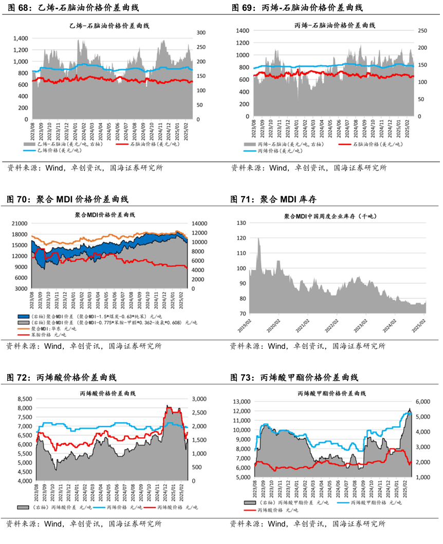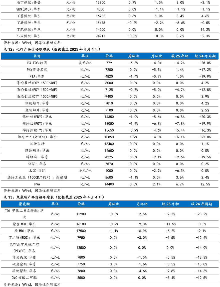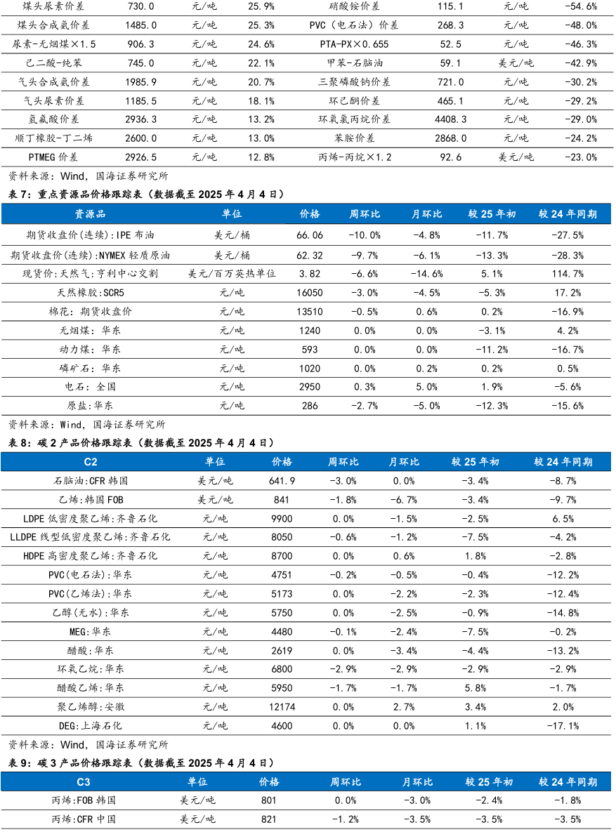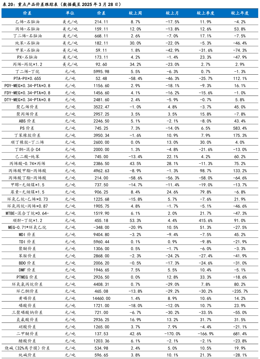 我们跟踪的171种产品的价格中,有33种上涨,占比19.3%,有51种产品下跌,占比29.82%。周涨幅前五的产品分别为:硫酸:全国(26.42%)、丙烯酸(8.82%)、合成氨:江苏恒盛(7.25%)、DMF:华东(4.62%)、辛醇(4.58%)。周跌幅前五的产品分别为:期货收盘价(连续):IPE布油(-9.98%)、期货收盘价(连续):NYMEX轻质原油(-9.73%)、航空煤油(3#):中石化(-7.12%)、现货价:天然气:亨利中心交割(-6.56%)、甲苯:FOB韩国(-6.46%)。本周(2025年3月28日-4月4日,下同)本周硫酸:全国价格上涨。成本端,硫磺价格仍盘整,尚有支撑。需求方面,成本价格高位牵动,磷肥价格窄幅向上。出口方面暂无利好消息,其下游及贸易商谨慎采购,肥料市场新单成交廖廖,肥企开工有下滑。钛白粉下游收货情绪,部分企业利润倒挂,开工本周继续下滑。整体来看,硫酸需求面略有利空。全国范围内,市场库存多保持低位;检修或停车主要表现在山西、辽宁、内蒙古、广西,安徽地区主力酸企周内退出检修,供应端平稳运行为主。本周丙烯酸市场偏强运行。丙烯酸生产工厂心态积极,且库存压力较小,下游用户消化涨幅为主。原料丙烯市场价格震荡整理为主,丙烯酸成本端支撑波动有限,丙烯酸利润空间增大。工厂多排单走货为主,持货商随行就市报盘,终端用户入市采买刚需跟进,市场商谈持续走高,终端对高价采买谨慎,消耗涨幅为主。精酸市场报价强势上涨,工厂现货惜售报盘重心走高,多交付合约和前期订单为主。本周合成氨:江苏恒盛价格上涨。本周东北、内蒙地区均有新增临停检修装置,北方局部供应再次收紧,对区域内及周边市场交投氛围存一定利好带动,且受山西、山东等地竞拍高价引导,加之下游受买涨不买跌情绪影响及临近清明节前适量补库支撑,多方利好影响下,北方价格大幅拉涨,华东及华中等地厂家多出货无压,受北方价格上行带动联动上调。本周甲苯甲苯场内交投偏弱。本周后期在美国关税落地影响下,国内大宗商品普遍低开,相关产品纯苯价格下行,甲苯市场谨慎观望情绪加重,场内低价商谈为主。本周丙烷价格下行。美国关税政策再升级,市场心态谨慎观望为主。山东某丙烯装置波动,化工需求支撑不足,燃烧需求节假日前后或有小幅提振。炼厂整体库存水平可控,但出货意愿仍存,主流持稳观望后市。本周天然橡胶市场价格震荡下行。周初海外橡胶减产,国内云南产区开割,原材料价格支撑减弱。终端需求维持弱势状态,叠加国内现货流通充足,期货盘面下跌,天然橡胶价格走势下行。周中,天然橡胶现货库存延续累库趋势,下游采购积极性欠佳,但期货盘面上涨,国内现货报盘小幅上涨。临近周末,期货盘面大幅下滑,场内交投氛围清淡,现货报盘走跌。