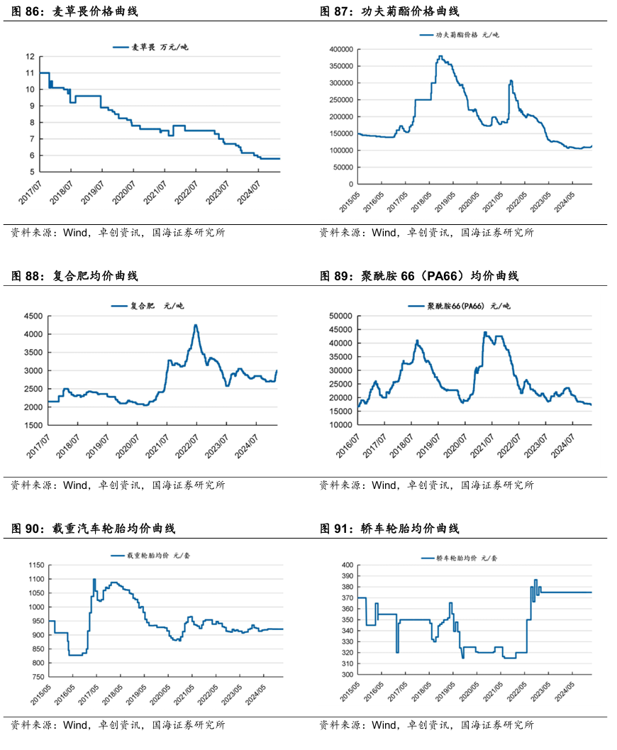 1)低成本扩张。主要公司包括但不限于:万华化学、轮胎(赛轮轮胎、玲珑轮胎、森麒麟、通用股份、贵州轮胎、风神股份、三角轮胎、浦林成山等)、卫星化学、宝丰能源、华鲁恒升、远兴能源、复合肥(新洋丰、云图控股、史丹利、芭田股份)、龙佰集团、扬农化工、农药制剂(润丰股份)、华峰化学、亚钾国际等。