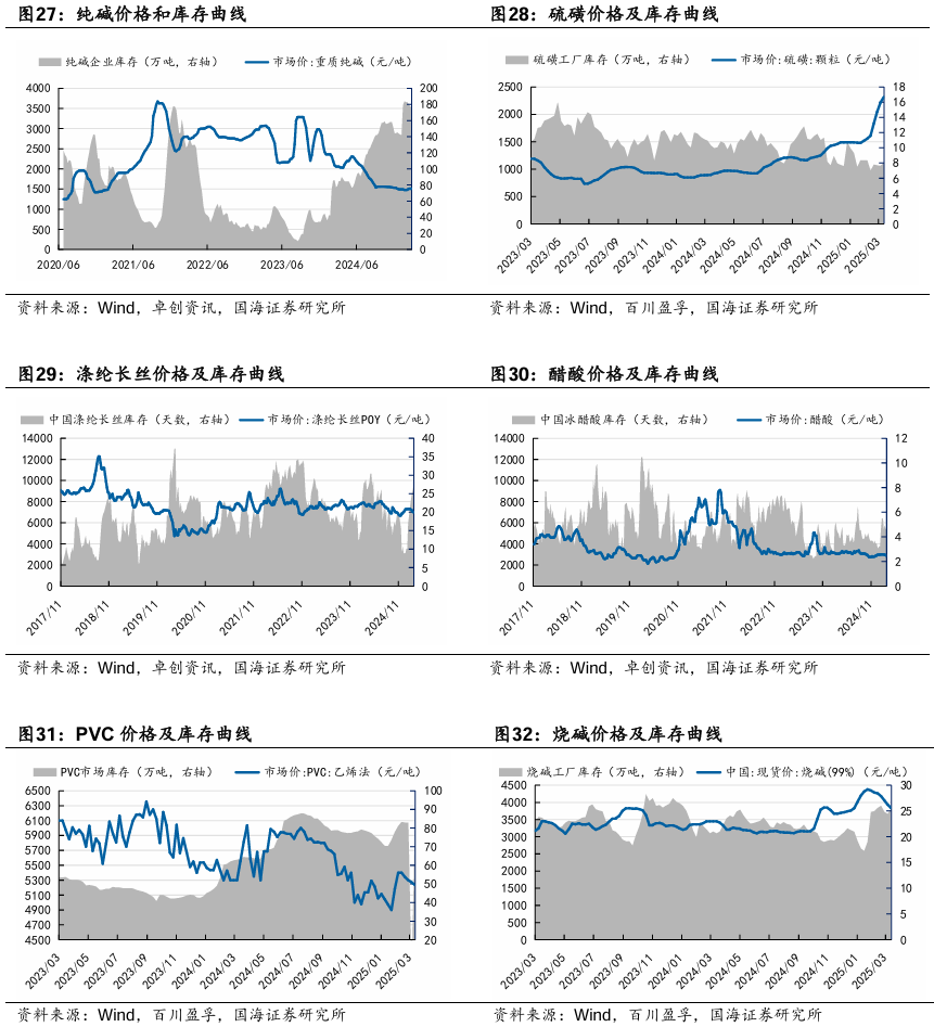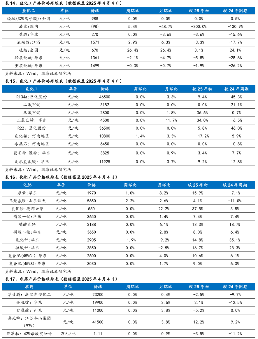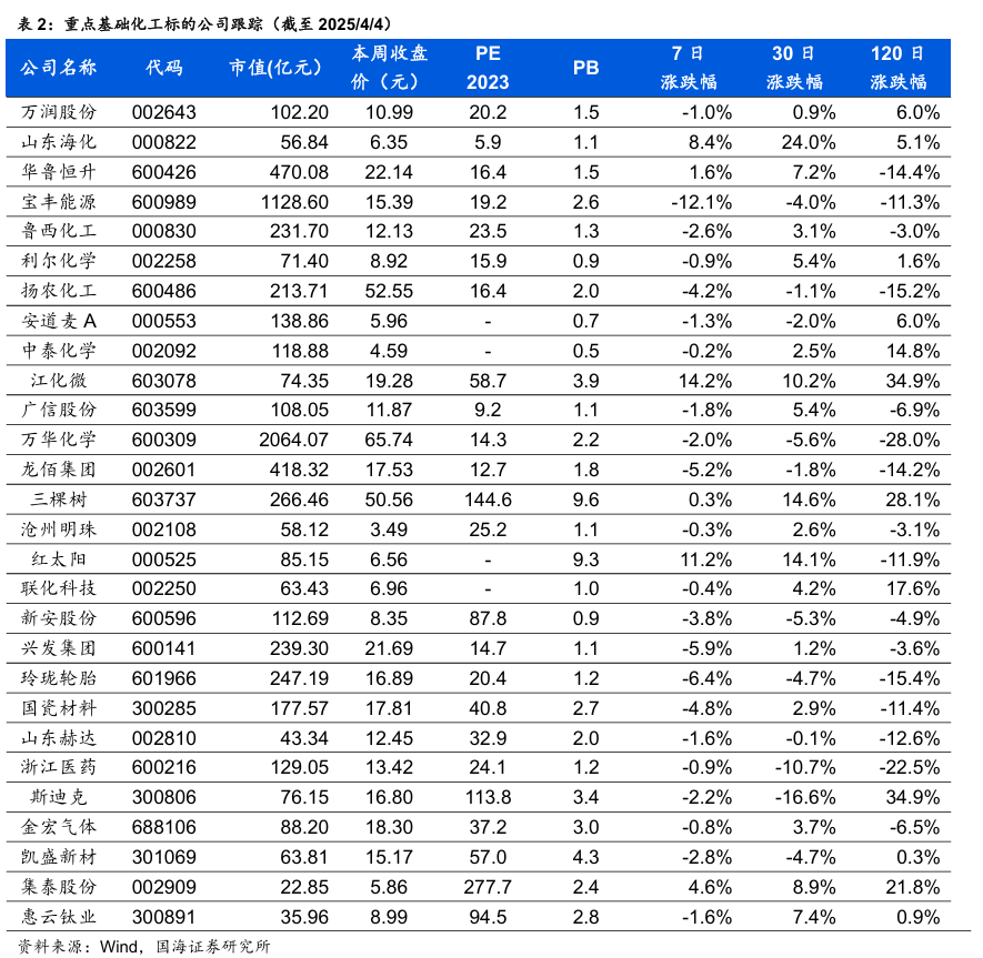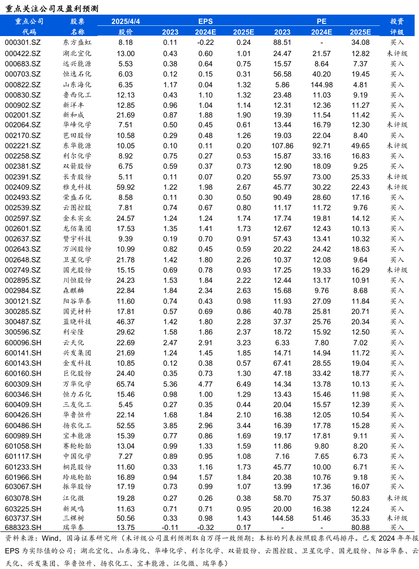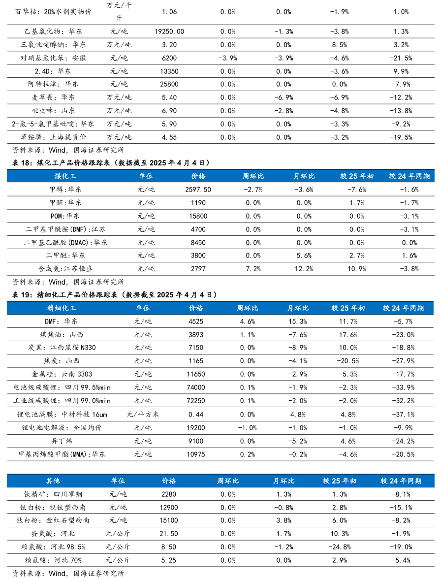 龙佰集团:公司作为钛白粉全球龙头,截至2023年末,拥有钛白粉产能151 万吨/年,海绵钛产能5万吨/年,规模均居世界前列。公司将依托现有的核心资源和优势,打造硫酸法钛白粉、氯化法钛白粉、海绵钛及高端钛合金的低成本联产体系;进一步完善绿色大循环产业链,着力打造一条囊括“钛矿采选加工~氯化法钛白粉~海绵钛~钛金属~钛材加工”一体化的全产业链。同时,公司利用自身产业链优势,投建磷酸铁、磷酸铁锂及人造石墨负极材料等产能,截至2023年末,磷酸铁锂产能 5 万吨/年,磷酸铁产能10 万吨/年,石墨负极产能2.5 万吨/年,石墨化产能 5 万吨/年。公司产品线由钛白粉延伸至钛金属、新能源,建成“钛、锆、锂”三条产业链和创新耦合发展体系,不断提高核心竞争力和盈利能力,实现经济效益、社会效益、生态效益同步提升。据百川盈孚,2025年4月3日,钛白粉市场均价达15109元/吨,环比3月28日上升451元/吨。中国化学:公司是化学工程领域国家队,坚持多元化发展战略,业务范围逐步由化工工程扩展至环境治理、基础设施等领域,并通过创新驱动大力开拓实业及新材料业务、现代服务业等。公司秉持“创新技术 特色实业”一体化发展战略,在做好工程主业的同时,力图通过创新驱动战略,实现向高附加值的实业领域延伸。2022年7月,天辰齐翔打通全流程并生产出优质己二腈产品,丙烯腈装置实现满负荷稳定运行,累计生产丙烯腈8万余吨,己二腈与己二胺负荷逐步提高,实现长周期稳定运行;2022年2月,华陆新材气凝胶项目调试成功,产出合格产品,累计生产气凝胶1.17万m³;2022年6月,东华天业PBAT主装置一系列开车成功,累计生产PBAT 6330吨,圆满实现“当年开工,当年建成,一年内投产”的目标;2022年,中国化学天辰泉州60万吨/年环氧丙烷、赛鼎科创3万吨/年相变储能材料等项目相继启动建设;2023年12月26日,中国化学天辰泉州60万吨/年环氧丙烷项目双氧水浓缩装置一次性开车成功,并产出合格的50%浓度双氧水产品;据公司2024年半年度报告,赛鼎科创3万吨/年相变储能材料、内蒙新材30万吨/年煤制乙二醇项目二季度顺利中交,7月底转入试车阶段,计划2024年三季度投入正常生产运行。阳谷华泰:公司作为以防焦剂、促进剂、不溶性硫磺等为核心产品的综合性橡胶助剂供应商,在全球范围内具有较强的竞争力。公司连续法不溶性硫磺技术突破,后续还有中间体M扩产、树脂扩张、高端助剂平台产品等新增项目带来高速增长。公司作为以防焦剂、促进剂、不溶性硫磺等为核心产品的综合性橡胶助剂供应商,在全球范围内具有较强的竞争力。截至2024年上半年,公司主导产品防焦剂CTP产销量约占全球60%以上的市场份额,保持领先优势;公司目前是继美国富莱克斯、日本四国化工株式会社之后第三家掌握连续法不溶性硫磺产业化技术的公司,产品竞争力已得到市场充分认可,可有效替代进口。据卓创资讯,4月4日,华北市场橡胶促进剂M日度市场价12950元/吨,环比3月28日下降200元/吨;促进剂NS日度市场价22500元/吨,环比3月28日下降100元/吨;促进剂TMTD日度市场价11950元/吨,环比3月28日持平。双箭股份:公司是国内输送带龙头企业。公司未来几年将加大输送带主业的投资,截至2023年底,公司输送带年产能9000万平方米/年,新建规划产能6000万平方米/年,到“十四五”末产能突破1.5亿平方米,我们认为公司将通过不断扩产,快速抢占行业增量部分。4月3日,公司发布2024年度报告。2024年,公司实现营业收入27.13亿元,同比增长4.64%;实现归母净利润1.54亿元,同比下降36.49%。华峰化学:据卓创资讯,4月3日,浙江市场氨纶40D为24500元/吨,环比3月28日持平;江苏市场氨纶40D为24500元/吨,环比3月28日持平。3月29日,公司发布2024年度报告。2024年,公司实现营业收入269.31亿元,同比增长2.41%;实现归母净利润22.20亿元,同比下降10.43%。新和成:截至2024年9月,公司目前拥有维生素A折50万IU计年产能为8000吨,维生素E以50%粉计年产能为6万吨。维生素技术工艺复杂,进入壁垒大,市场集中度高,随国内饲料行业的稳步发展,维生素需求将继续保持增长。作为全球维生素A和E寡头企业之一,公司未来业绩将继续上升。截至2024年上半年,公司已投放蛋氨酸产能30万吨/年。另外,公司与中国石油化工股份有限公司合资建设的18万吨/年液体蛋氨酸(折纯)项目建设稳步推进。同时,公司未来计划将PPS产能扩增至3万吨,随新材料产业需求的不断扩大,公司将推进新材料一体化产业链建设,盈利空间继续扩大;“黑龙江新和成生物发酵产业园一期项目”已经在2020年10月份全面投产,进一步提升公司的长期盈利能力。据Wind,2025年4月3日,维生素A价格为94元/千克,环比3月28日下降1元/吨;维生素E价格为123元/千克,环比3月28日持平。远兴能源:据Wind和百川盈孚,2025年4月4日重质纯碱价格为1499元/吨,较3月28日下降5元/吨;轻质纯碱价格为1361元/吨,较3月28日下降29元/吨;尿素价格为1937元/吨,较3月28日下降3元/吨;动力煤价格为680元/吨,较3月28日持平。