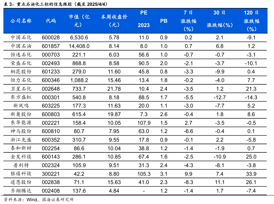 东方盛虹:公司坚持从“一滴油”到“一根丝”的全产业链布局,1600万吨/年炼化一体化项目于2022年12月顺利打通全流程并全面投产,项目拥有目前国内单体规模最大的常减压装置,加工能力1600万吨/年,主要产品包括110万吨/年乙烯,280万吨/年对二甲苯,190万吨/年乙二醇,30万吨/年醋酸乙烯,40万吨/年苯酚,25万吨/年丙酮等基础化工产品。公司已完成对斯尔邦的收购,斯尔邦专注高附加值烯烃衍生物的生产,目前主要产能包括30万吨/年EVA、52万吨/年丙烯腈、42万吨/年环氧乙烷及其衍生物、17万吨/年MMA、10万吨/年丁二烯及8万吨/年SAP。通过此次交易,公司将置入盈利能力较强的优质资产,产业链布局进一步完善,同时业务向EVA等新能源材料领域延伸,将为公司带来新的业绩增长点,核心竞争力持续增强。据Wind,2025年4月4日EVA价格为11700元/吨,较3月28日持平。恒逸石化:公司是国内PTA和聚酯纤维的综合制造商,已完成“原油炼化-PX-PTA-聚酯”和“原油炼化-苯-己内酰胺-锦纶”的双产业链布局,目前参控股PTA年产能1600万吨,聚酯年产能776.5万吨,规模优势强,技术领先,成本优势明显。恒逸文莱炼化项目一期已于2019年9月投产,炼油产能达到800万吨,PX产能150万吨。二期项目稳步推进,项目1400万吨/年炼能,投资金额预计为136.54亿美元。产品包括200万吨/年对二甲苯、255万吨汽油等,同时也包括165万吨/年乙烯、250万吨/年PTA、100万吨/年聚酯瓶片,将给予公司盈利大幅增长的能力。卫星化学:公司是国内领先的轻烃产业链一体化生产企业,拥有国内首套进口乙烷综合利用装置、首套丙烷脱氢装置,国内最大的丙烯酸生产装置,HDPE、EO、EG、SAP、聚醚大单体、双氧水等多个产品产能位居国内前列。公司强链补链延链,发挥产业链一体化优势,扎实推进了连云港石化绿色新材料项目,截至2022年底,各产品生产装置完成中交或已接近建成,将进一步增加公司产业链一体化的运营效率。平湖基地新能源新材料项目于2023年10月开工建设,将更加高效利用PDH的丙烯资源生产多碳醇,形成丙烯-丙烯酸-丙烯酸酯的产业链闭环。嘉兴基地加快推进26万吨高分子乳液项目建设,拓宽丙烯酸酯下游向中高端纺织乳液、涂料乳液、粘合剂、电池粘合剂与涂覆剂等化学新材料发展,促进公司产业链在质与量上的大幅提升。据Wind,2025年4月3日丙烯酸价格为7250元/吨,环比3月28日上升400元/吨。桐昆股份:作为国内涤纶长丝龙头,截至2023年末,公司已具备1000万吨原油加工权益量、1020万吨PTA、1300万吨聚合、1350万吨涤纶长丝年生产加工能力,具有较大的市场话语权。截至2023年底,嘉通能源石化聚酯一体化项目年产500万吨PTA、240万吨聚酯纺丝装置全面建成投产。同时,公司还拟投资150亿元在江苏沭阳建设240万吨/年长丝(短纤)产能,投资150亿元在福建古雷建设200万吨/年聚酯纤维产能,核心竞争力持续提升。新凤鸣:新凤鸣是国内规模最大的涤纶长丝制造企业之一,综合实力强。规模优势和竞争力不断增强。公司积极完善上游产业链,在独山能源500万吨PTA产能的基础上又合理规划了540万吨PTA产能,不断向上开拓一体化布局,为公司聚酯生产提供了强有力的稳定的原材料供应。