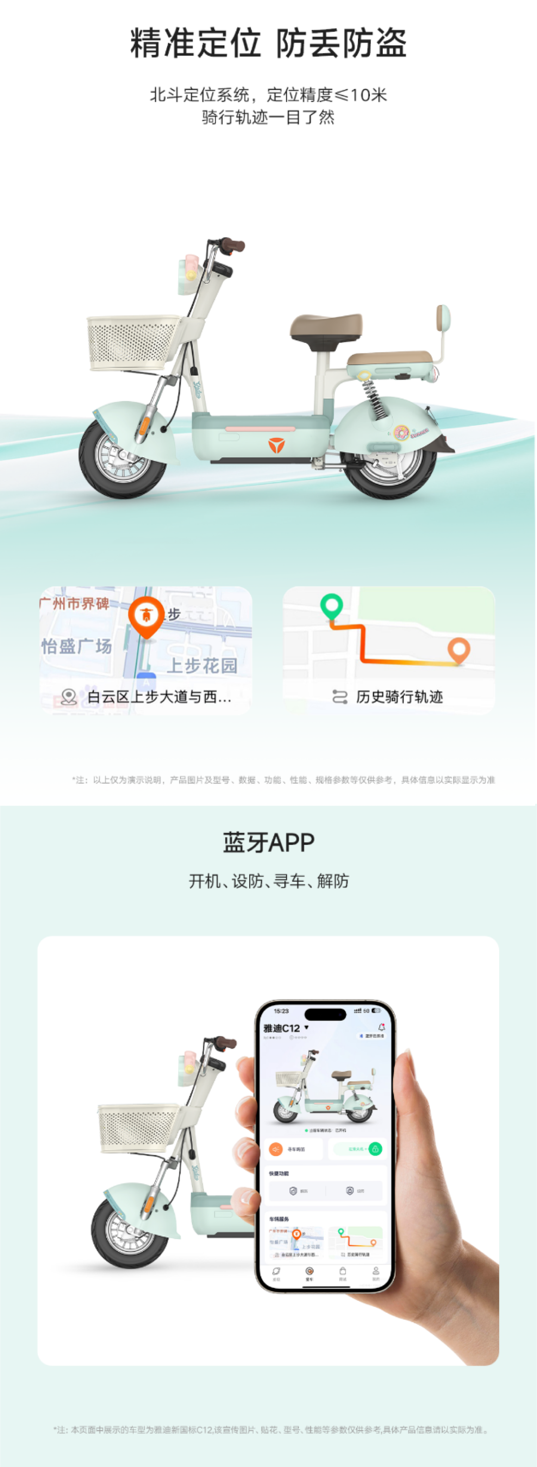 以雅迪C12车型为例,该车搭载北斗定位系统,精度达10米,基于精准定位功能实现电子围栏与骑行轨迹查询,防止车辆丢失被盗。用户可通过蓝牙连接“雅迪智行”App,通过App实现智能控车、智慧导航、远程查看车辆状态、一键寻车、预设电子围栏、异动报警等智能化功能。此外,该车还搭载了多项实用技术,TCS防侧滑系统、HDC陡坡缓降功能,提升用户行车安全性。