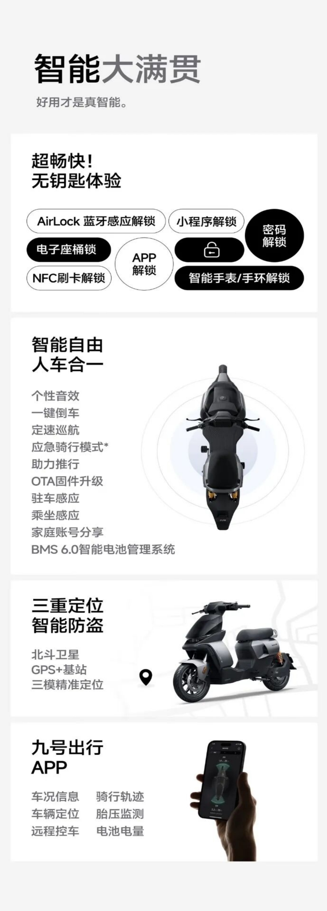以Mmax2系列中机械师Mmax2 130p为例,该车在智能化配置上搭载18项功能,具备北斗卫星、GPS 基站三重精准定位,可智能防盗、AHRS姿态感应防盗、黑匣子 事故主动求救、远程开关机 控车、驻车感应2.0、乘坐感应2.0、BMS 6.0智能电池管理系统等。用户可通过“九号出行”App查看车况信息、车辆定位、骑行轨迹等。