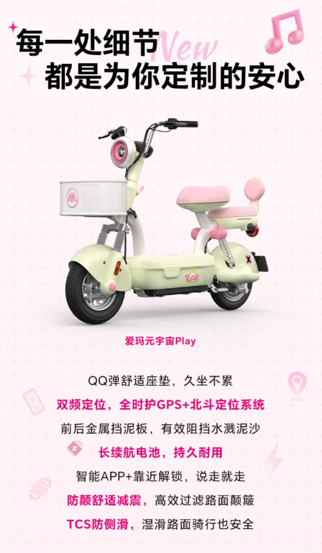 爱玛新国标车辆搭载全时护GPS 北斗定位系统、支持智能APP互联、无感解锁、TCS防侧滑、边撑感应控车等功能。