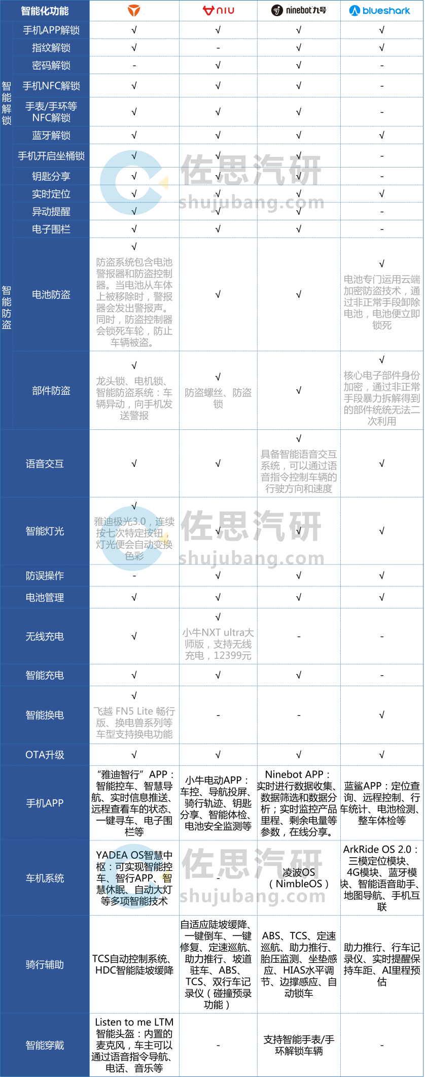 电动两轮车智能化汇总表(部分)