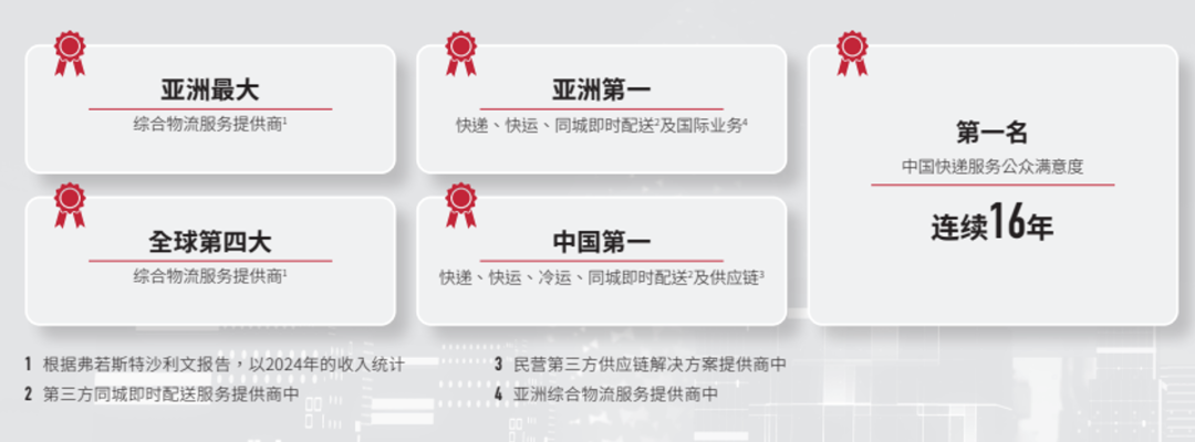当然,顺丰控股早已不是单一的快递企业。经过多年“1到N”全域扩张,顺丰控股已突破单一时效快递的业务局限,成长为全球领先的综合物流服务商。根据其2025年年报表述,“其时效快递业务占据国内市场领先地位,并于国内的快递、快运、冷运、同城即时配送及供应链业务五个细分领域,以及于亚洲的快递、快运、同城即时配送及国际业务四个领域均处于细分市场第一的领先地位。”