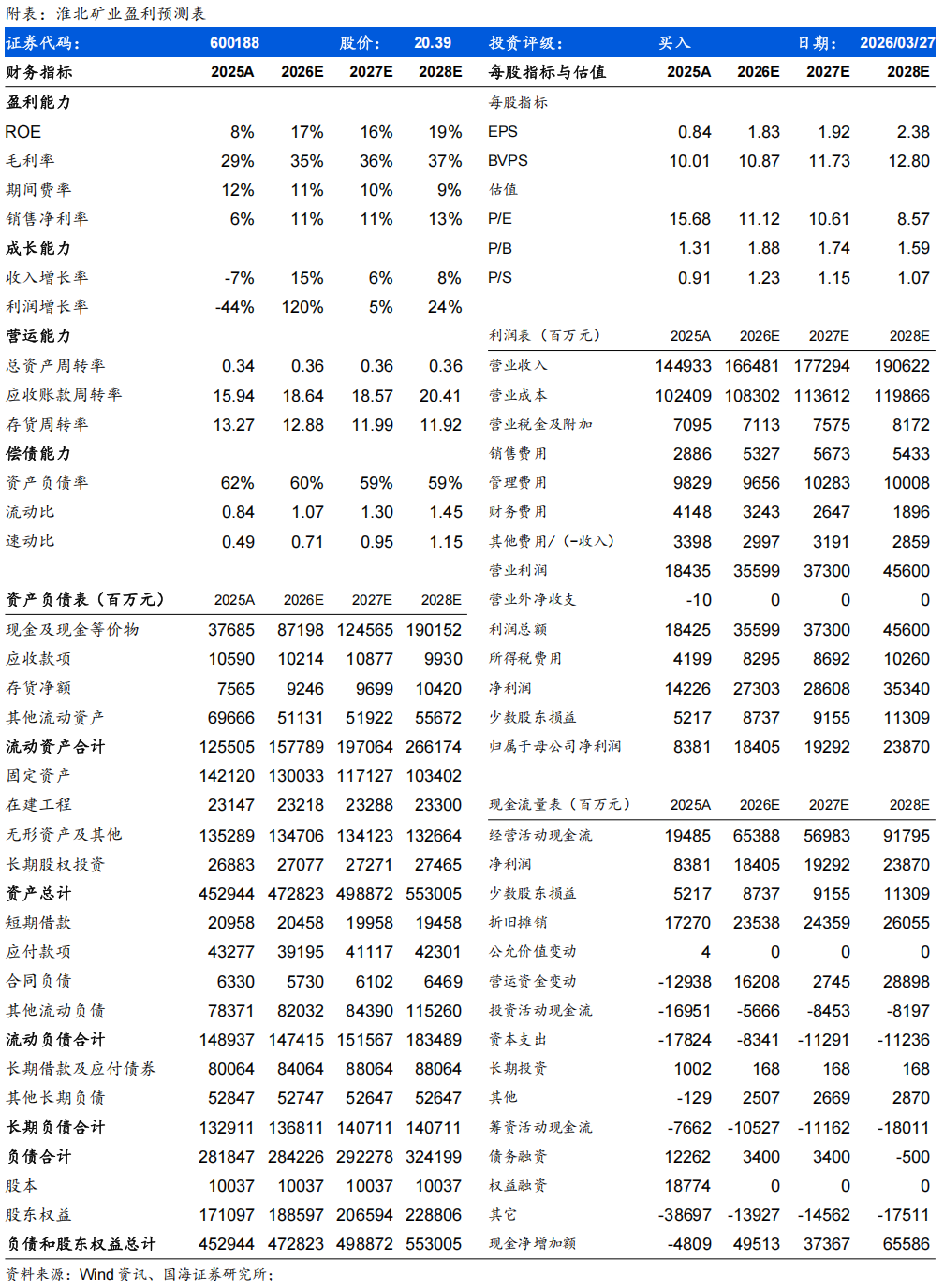 盈利预测与投资评级:我们预计公司2026-2028年营业收入分别为1665/1773/1906亿元,同比 15%/ 6%/ 8%,归母净利润分别为184/193/239亿元,同比 120%/ 5%/ 24%;EPS分别为1.83/1.92/2.38元,对应当前股价PE为11/11/9倍。考虑到公司项目储备多,未来煤炭产量增长空间大,且高分红高股息彰显投资价值,维持“买入”评级。