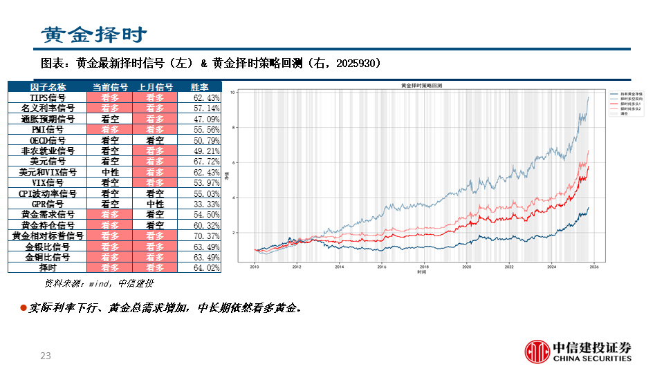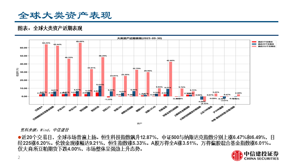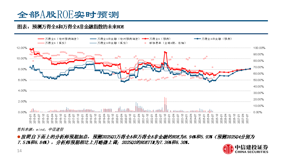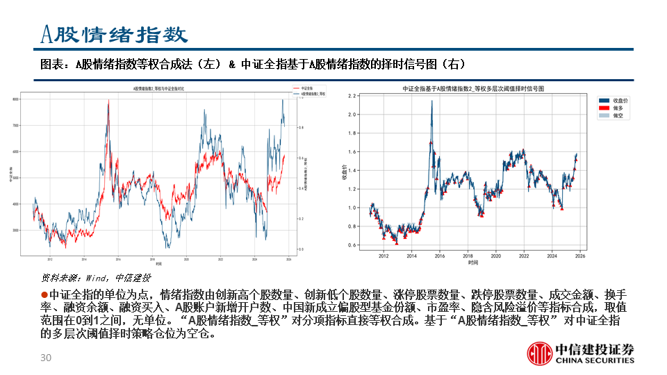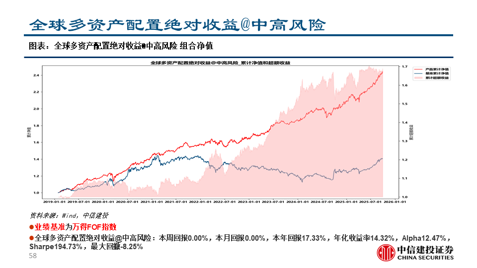 全球多资产配置绝对收益@低风险组合、全球多资产配置绝对收益@中高风险组合、A股行业和风格轮动指数@相对收益组合,9月回报分别为0.46%、2.57%、3.56%,本年回报分别为2.57%、17.33%、29.16%。预测2025Q3万得全A和万得全A非金融的ROE为6.94%和5.93%(预测2025Q4分别为7.51%和6.84%),分析师预期相比上月略微上调;对万得全A指数2025Q4的内在价值估计继续上行。美国和日本GDP同比进入下行周期,预测欧元区GDP同比高点在2025Q3,预测日元相对美元的弱势,预测欧元相对美元的强势衰减,预测美元计价的黄金将继续走强。基于情绪指数对A股和港股的择时观点为空仓;A股,看多大盘、成长风格的相对收益,看多机械、电力设备及新能源、国防军工、商贸零售和通信行业的相对收益。
