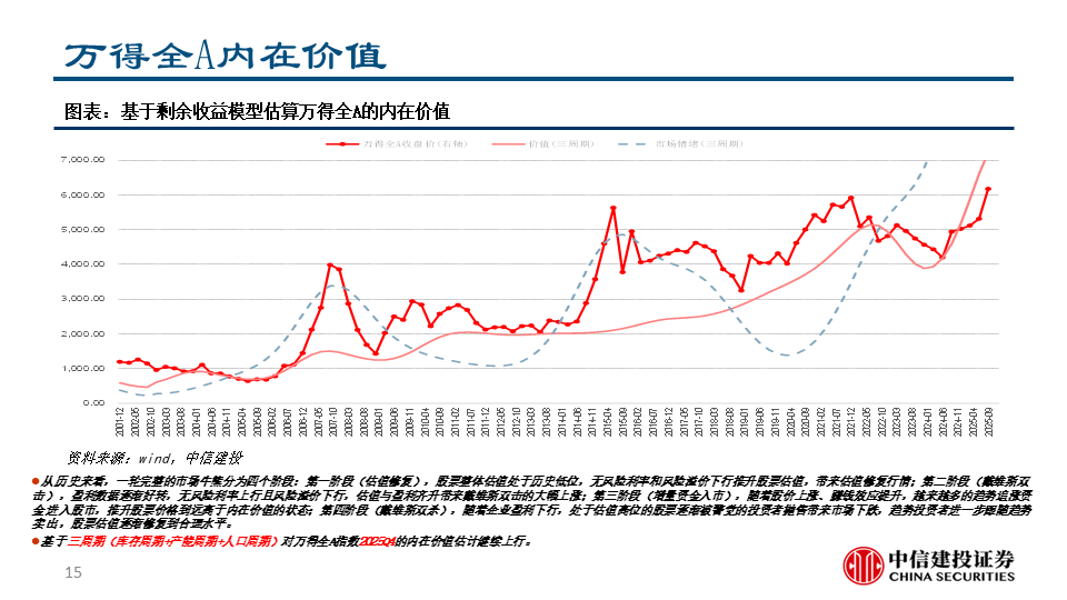 基本面和资产价格展望:按照自下而上的分析师预期加总,预测2025Q3万得全A和万得全A非金融的ROE为6.94%和5.93%(预测2025Q4分别为7.51%和6.84%),分析师预期相比上月略微上调;2025Q2的ROETTM为7.36%和6.30%。基于三周期(库存周期 产能周期 人口周期)对万得全A指数2025Q4的内在价值估计继续上行。美国和日本GDP同比进入下行周期,预测欧元区GDP同比高点在2025Q3,预测日元相对美元弱势,预测欧元相对美元的强势衰减;预测美元计价的黄金继续走强。基于情绪指数对A股和港股的择时观点为空仓;A股风格方面看多大盘、成长的相对收益。