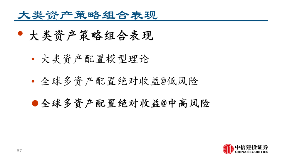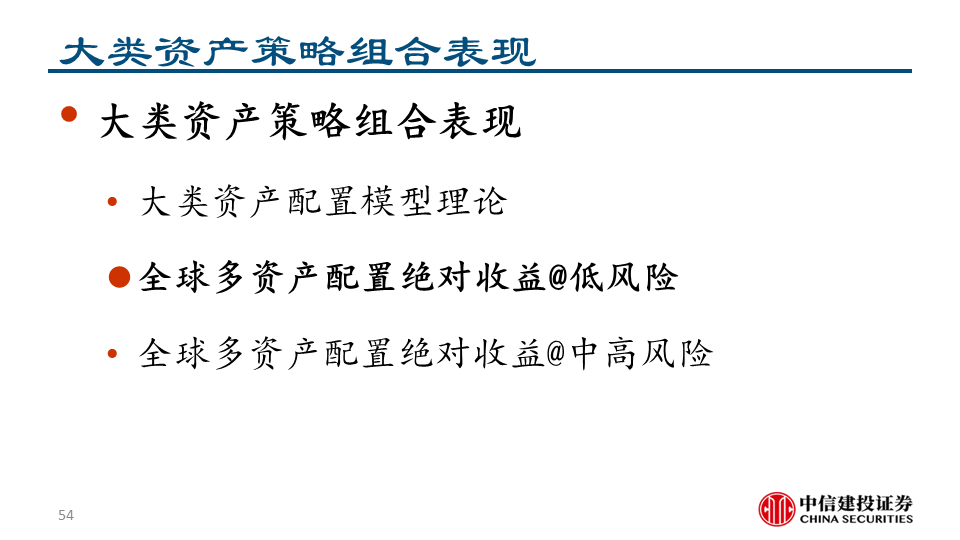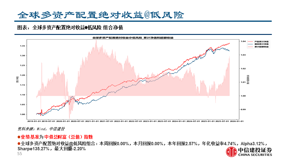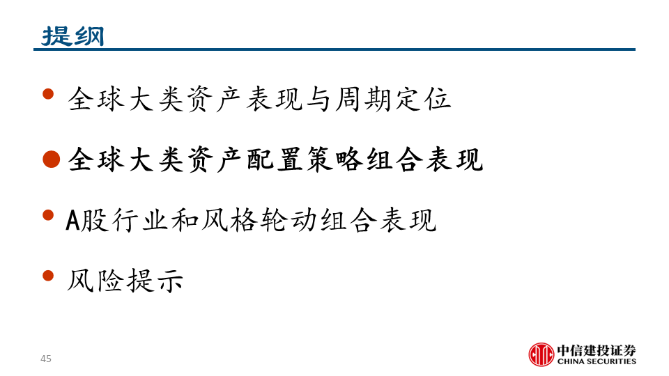 全球多资产配置策略组合跟踪:全球多资产配置绝对收益@低风险组合,9月回报0.46%,本年回报2.57%,年化收益率4.74%,最大回撤-2.20%;全球多资产配置绝对收益@中高风险组合,9月回报2.57%,本年回报17.33%,年化收益率14.32%,最大回撤-8.25%;A股行业和风格轮动指数@相对收益组合:9月回报3.56%,本年回报32.39%,年化收益率29.16%,最大回撤-25.25%。