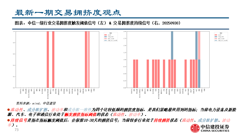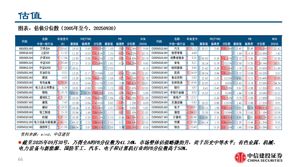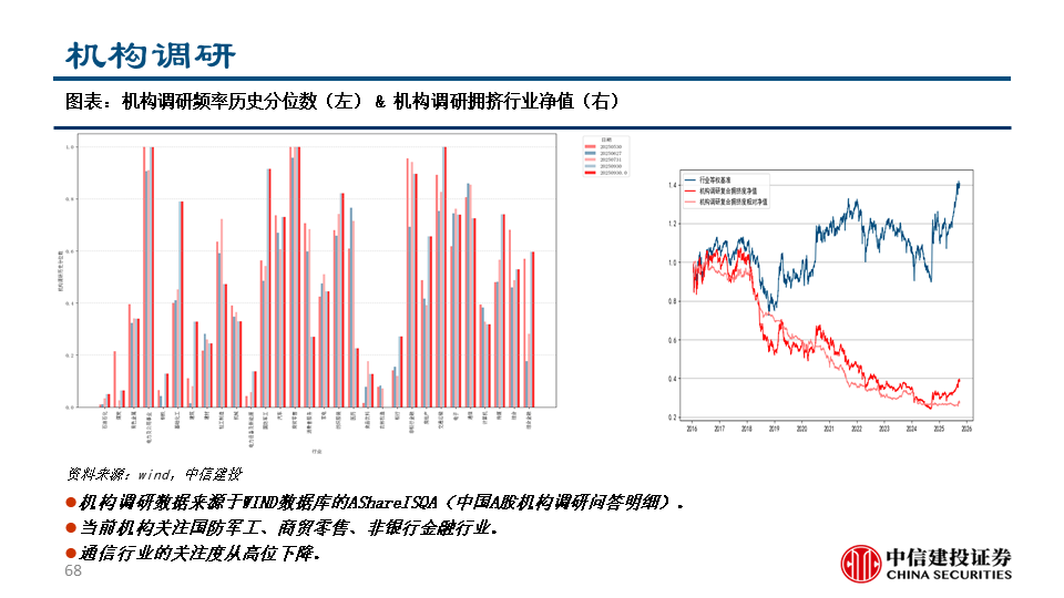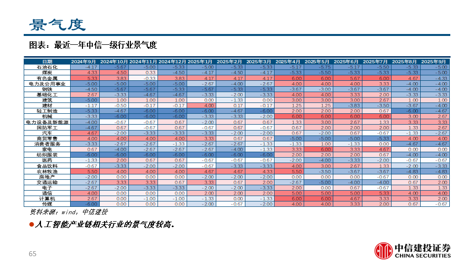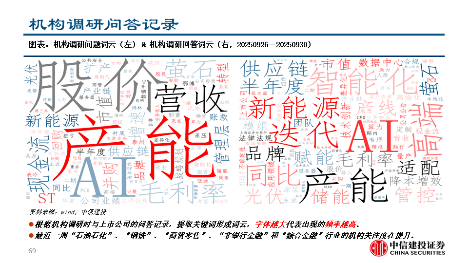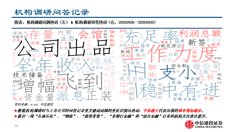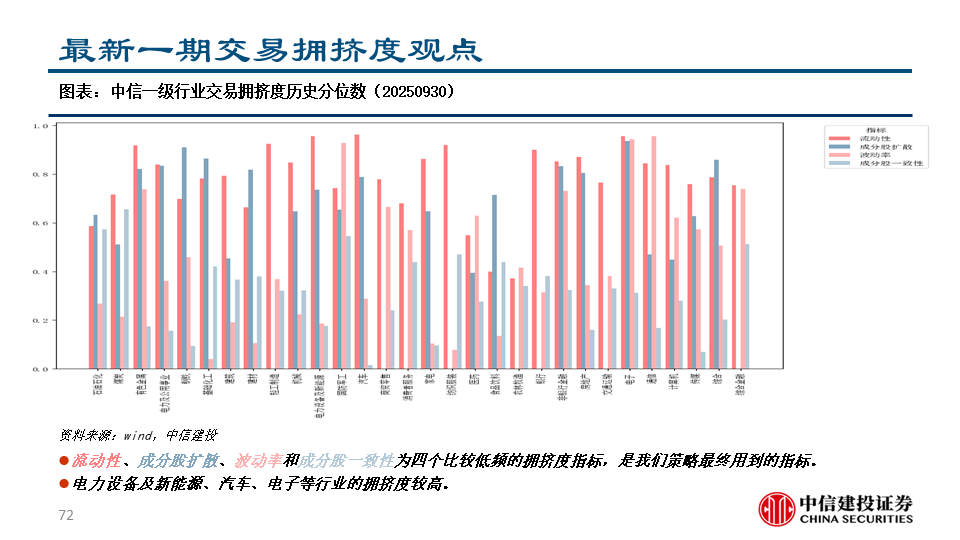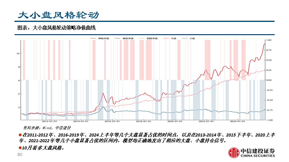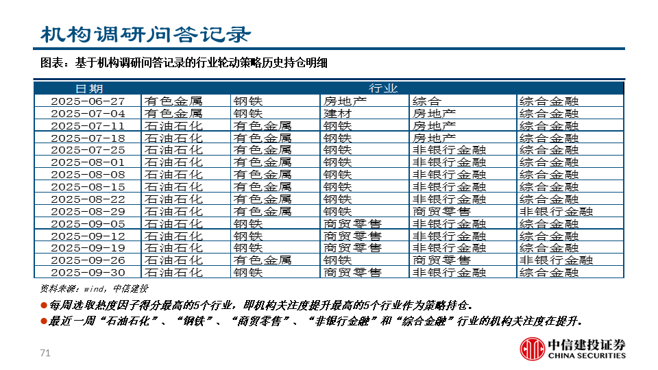 A股行业和风格轮动@相对收益:基于财务报表、分析师预期和行业中观数据构建行业景气度指标,机械、电力设备及新能源、国防军工、商贸零售和通信的景气度比较高。截至2025年09月30号,有色金属、机械、电力设备与新能源、国防军工、汽车、电子和计算机行业的PB分位数高于50%,行业之间估值分化程度有所下降。当前机构关注国防军工、商贸零售、非银行金融行业,通信行业的关注度从高位下降。最近一周“石油石化”、“钢铁”、“商贸零售”、“非银行金融”和“综合金融”行业的机构关注度在提升。当前电力设备及新能源、汽车、电子和通信行业处于触发拥挤指标阈值的状态(流动性、波动率);近期整体拥挤信号和拥挤行业数量从高位下降。综合多维度, 2025年10月看多机械、电力设备及新能源、国防军工、商贸零售和通信的相对收益;行业轮动策略历史详细业绩信息请关注Wind-PMS组合,“A股行业和风格轮动指数@相对收益”。