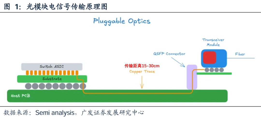 传输速率需求上升凸显传统光模块长距离电信号传输弊端。传统机柜间主要采用光模块进行光电转换信号传输,根据Semi analysis,进行光通信的光模块通常位于距离XPU或交换ASIC 15-30厘米处,因此电信号需经长距离PCB走线传输到光模块。近年来随着大模型Token消耗需求量的持续上升,数据中心的带宽和能效要求也随之提升,其中在I/O接口数量有限的情况下,SerDes的信号传输速率提升是主要方向,而这会使光模块的长距离PCB电信号传输面临信号完整性和功耗的双重制约。